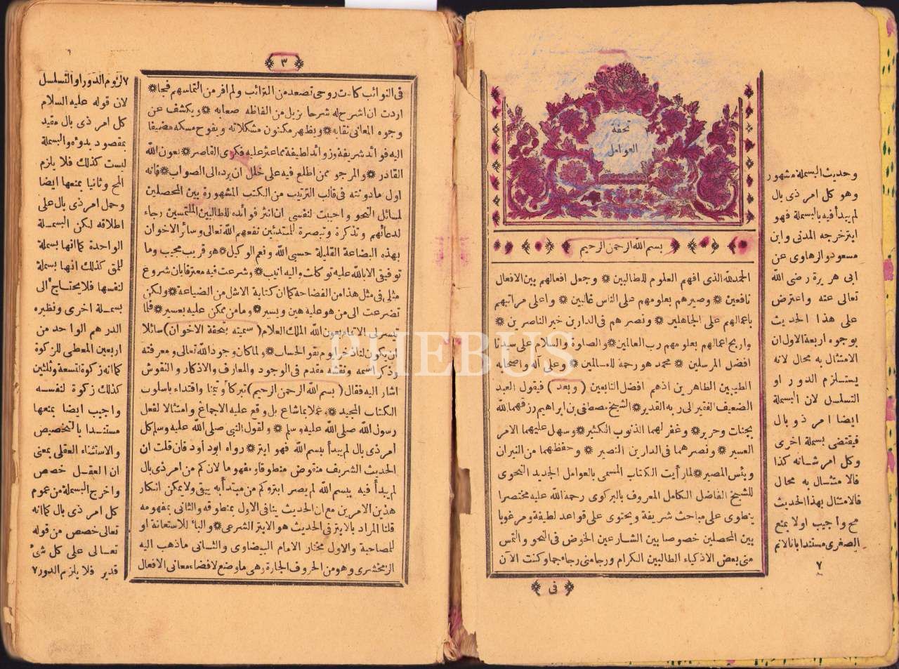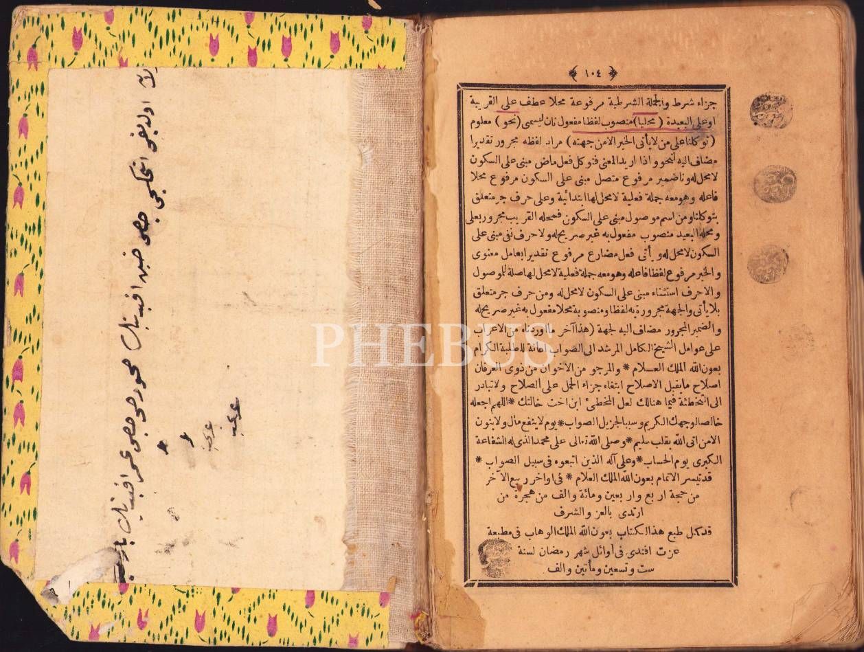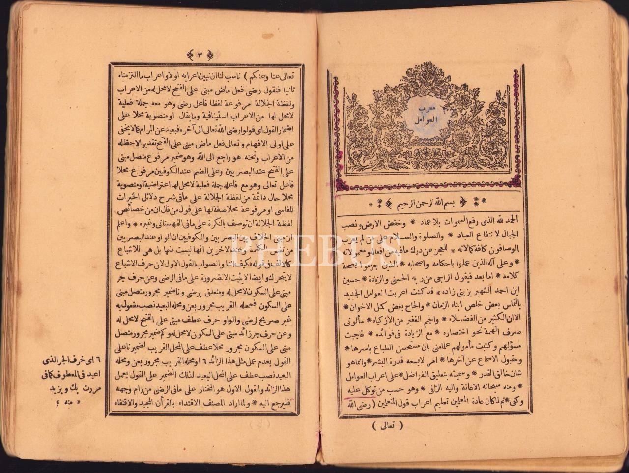 Arapça 2 eser tek ciltte: Tuhfetü'l-Avâmil, Gelibolulu Mustafa b. İbrahim, 80 s.; Mu'ribu'l-Avâmil, Zeynizade Hüseyin b. Ahmed, 104 s., İzzet Efendi Matbaası, 1296, 14x22 cm, cildi ve sayfa uçları yıpranmış haliyle