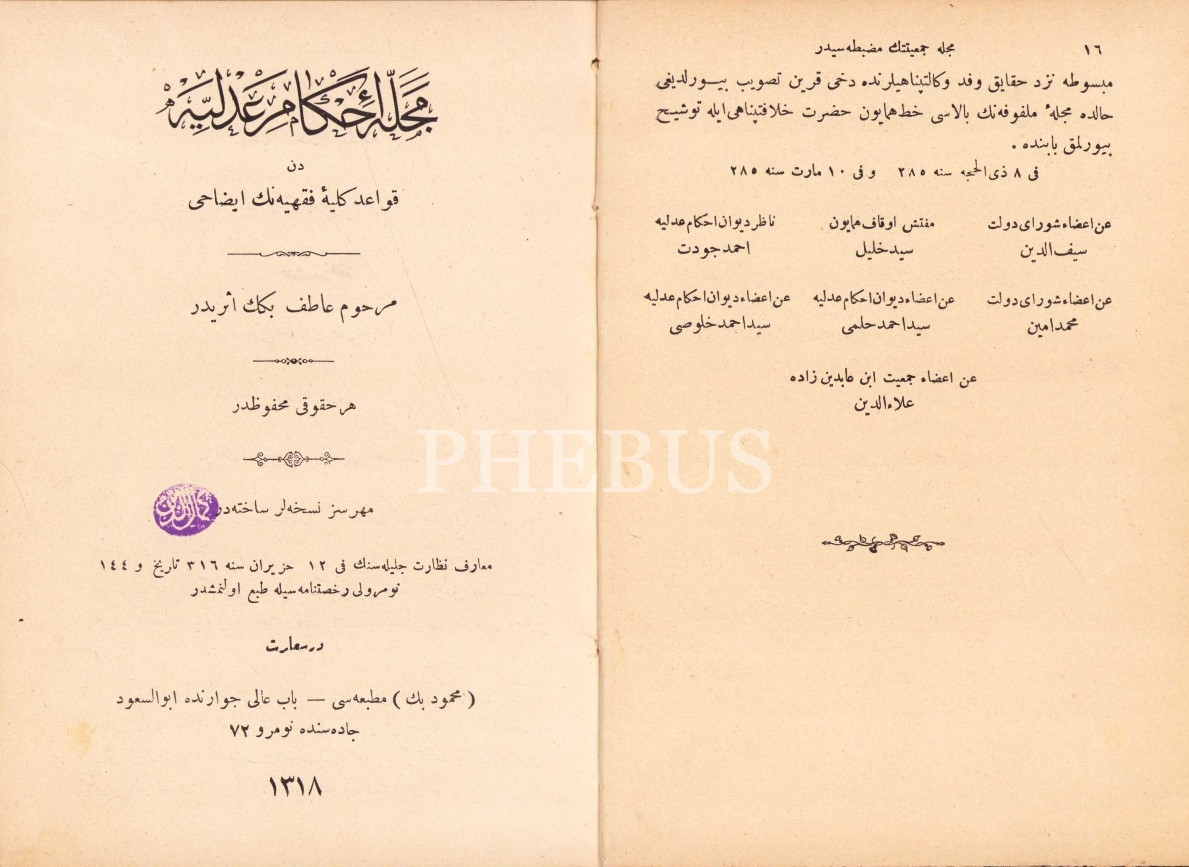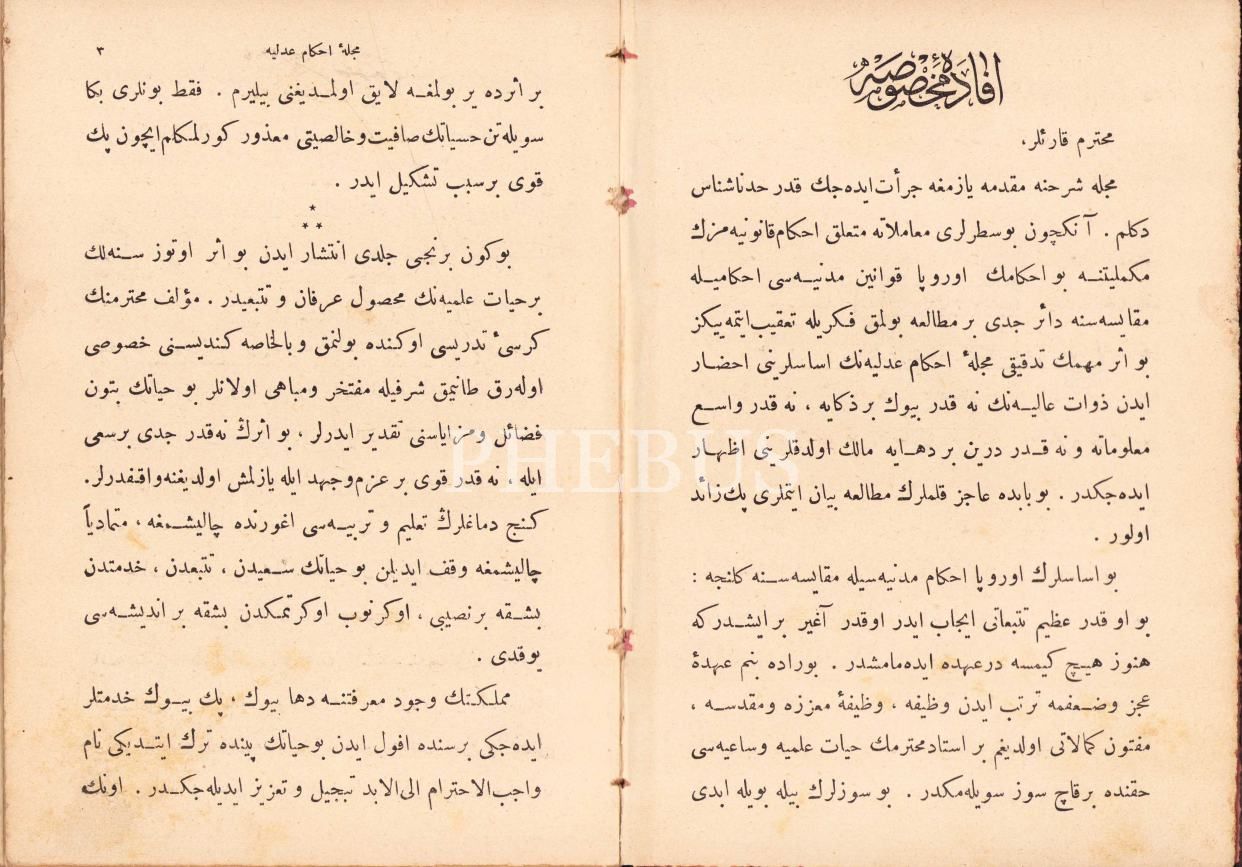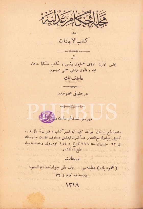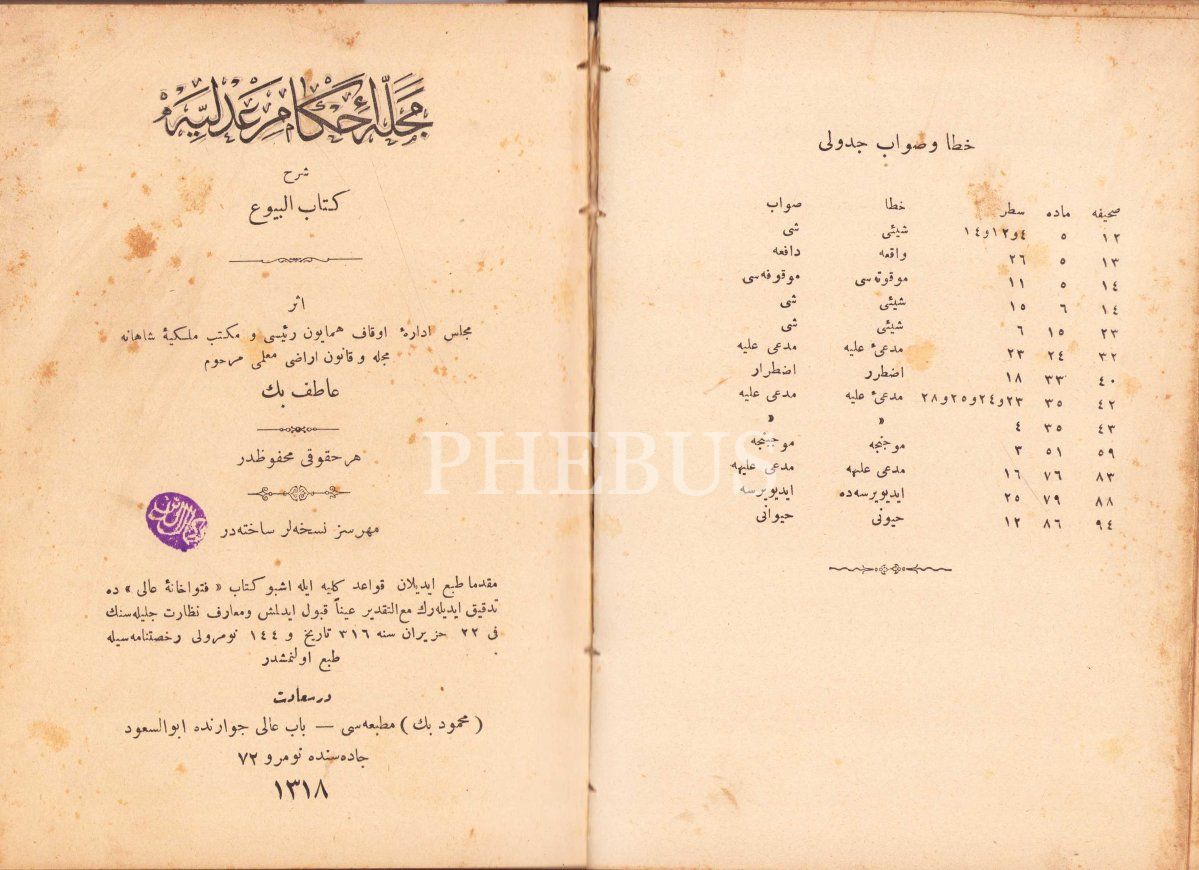 Osmanlıca 4 kitap tek ciltte: Mecelle-i Ahkâm-ı Adliyye'den Kavâid-i Külliyye-i Fıkhiyyenin Îzâhı,Kitâbu'l-Buyû', Kitâbu'l-İcârât, Atıf Bey, Mahmud Bey Matbaası, 111+190+143 s.;