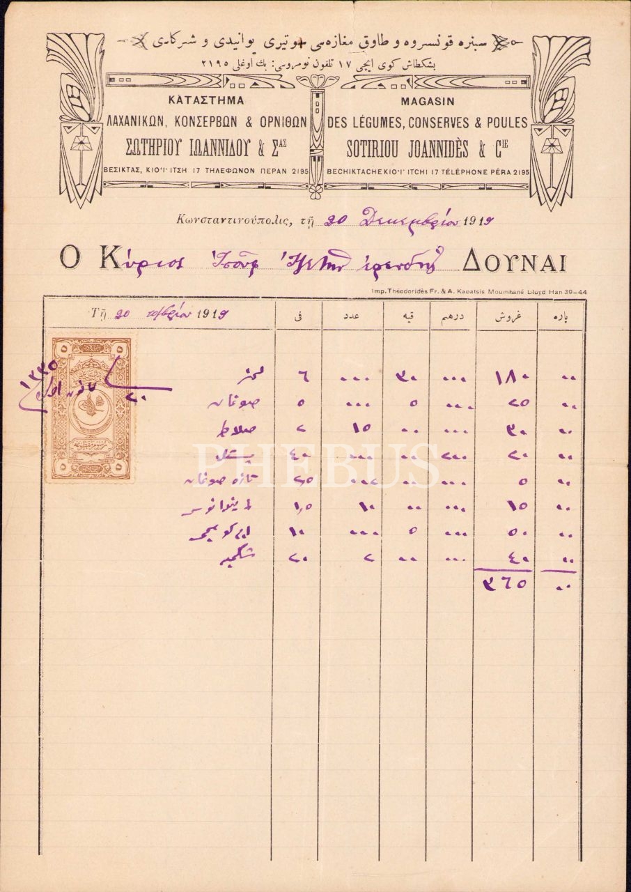 Osmanlıca, Rumca ve Fransızca "Sotiriou Joannides" Sebze Konserve ve Tavuk Mağazası Faturası, 20x27 cm