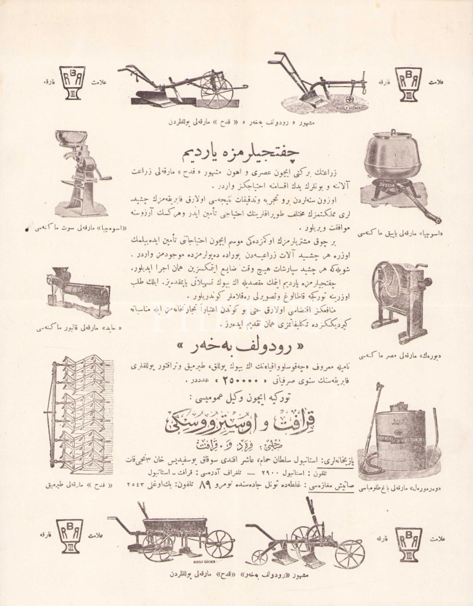 Osmanlıca Çiftçilik Araçları Üreten Rudolf Bacher Firmasının Türkiye Vekili'nin Reklam İlânı, "Çiftçilerimize Yardım", 24x30 cm