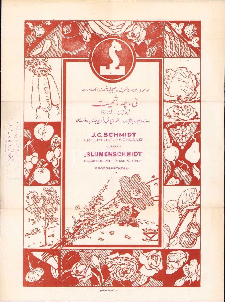 İhap Hulusi Tasarımı Osmanlıca ve Almanca Matbu Çiçek ve Sebze Tohumları Firması "Schmidt"in Reklam İlanı, Ahmed İhsan Matbaası, 25x34 cm ,