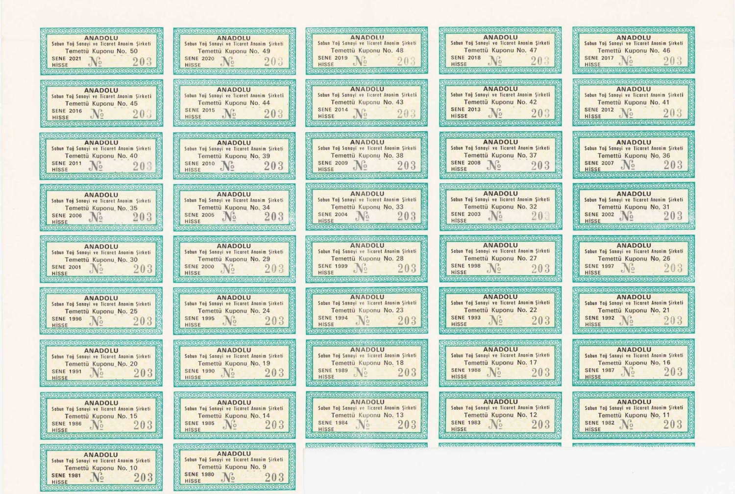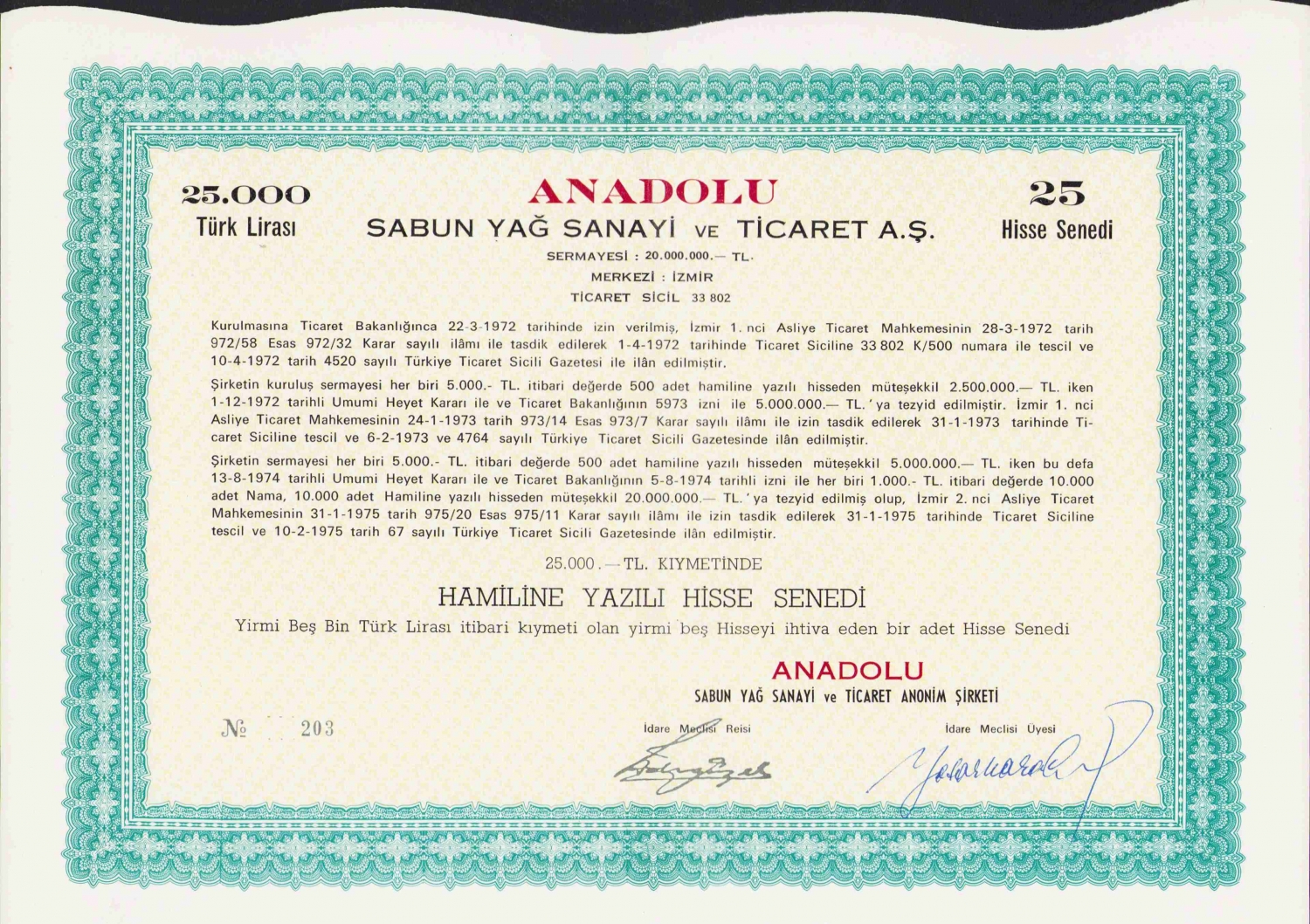 Anadolu Sabun Yağ Sanayi ve Ticaret AŞ, hamiline yazılı hisse senedi, 25 bin ederli, 1977 tarihli, 34x46cm