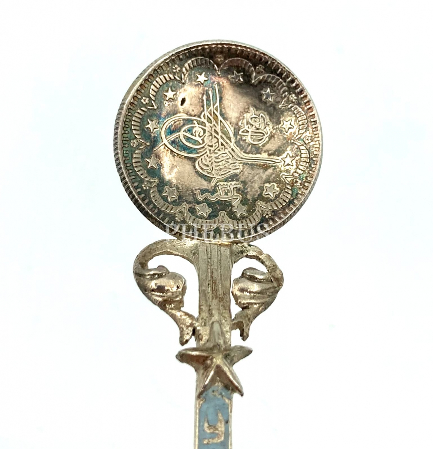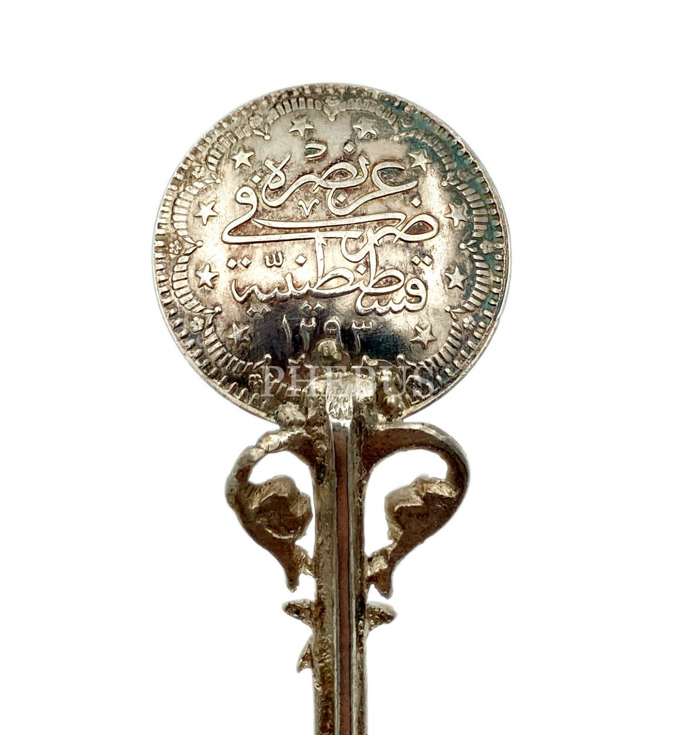 Sultan Abdülhamid Tuğralı 1293 Tarihli Osmanlı Madenî Parası Tasvirli Gümüş Kaşık, ucu ay-yıldızlı, Osmanlıca "Afiyet Olsun" yazılı, 13x3 cm