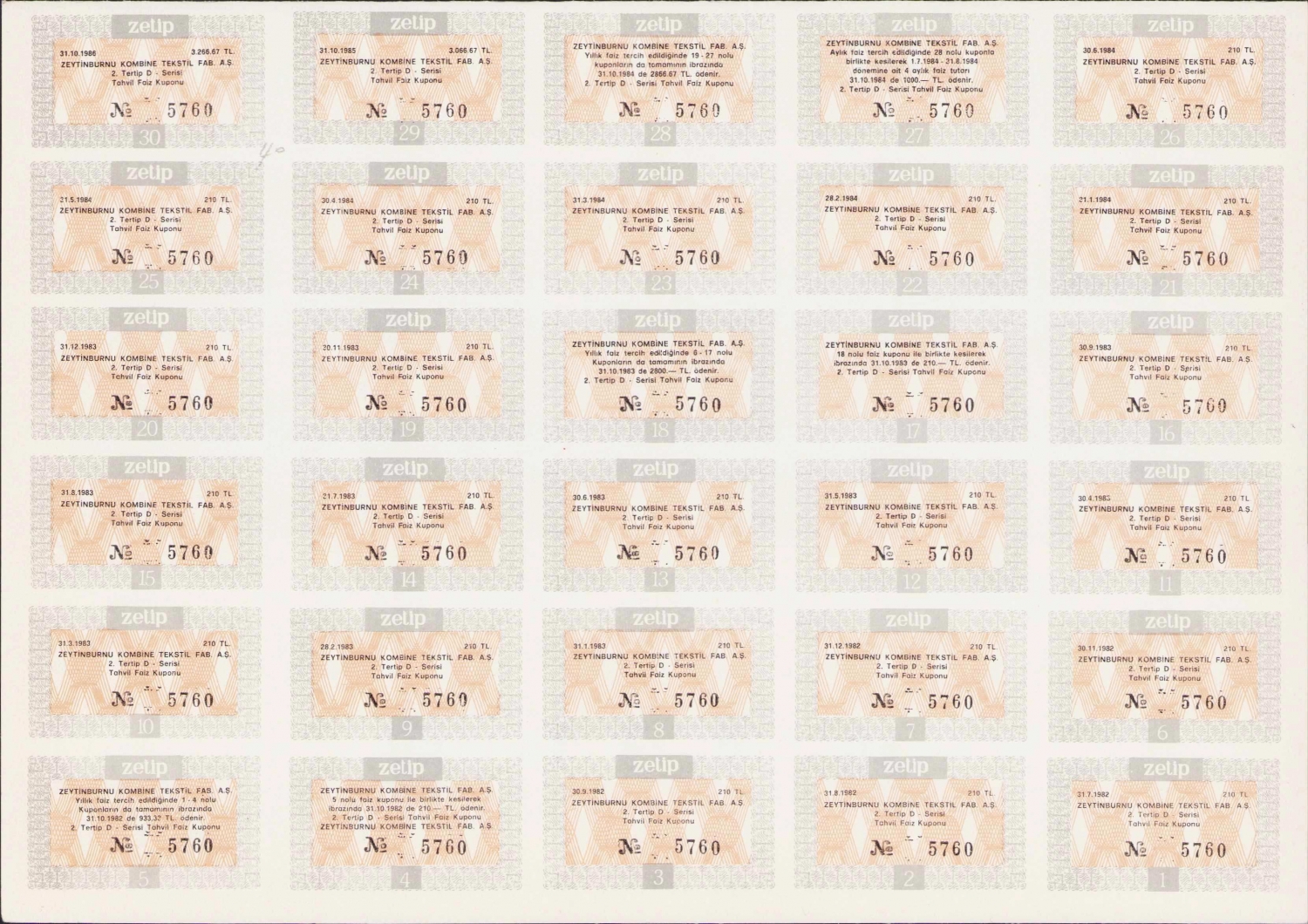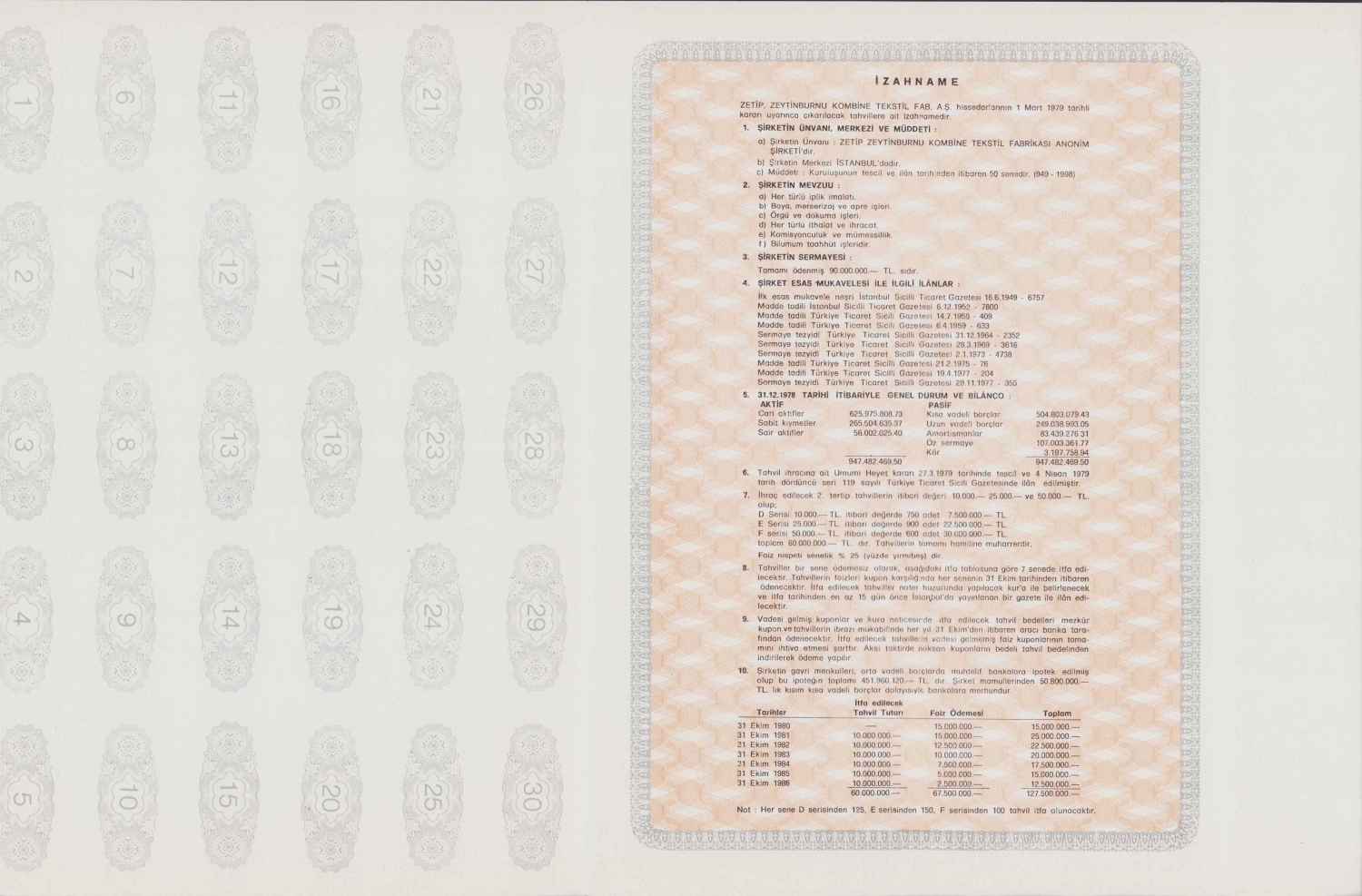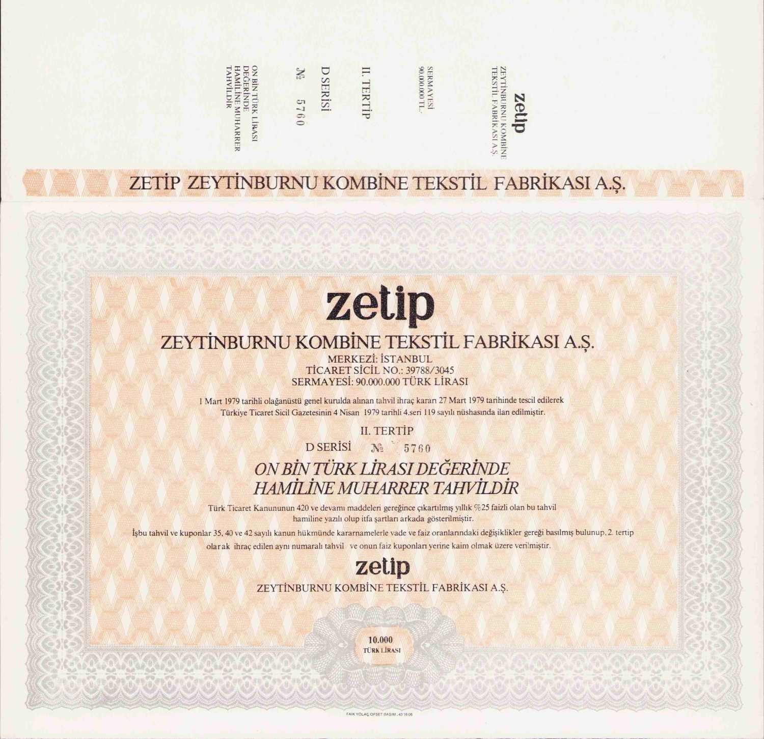 Zetip Zeytinburnu Kombine Tekstil Fabrikası AŞ, hamiline tahvil, 10 bin tl ederli, 1979 tarihli, 28x48cm