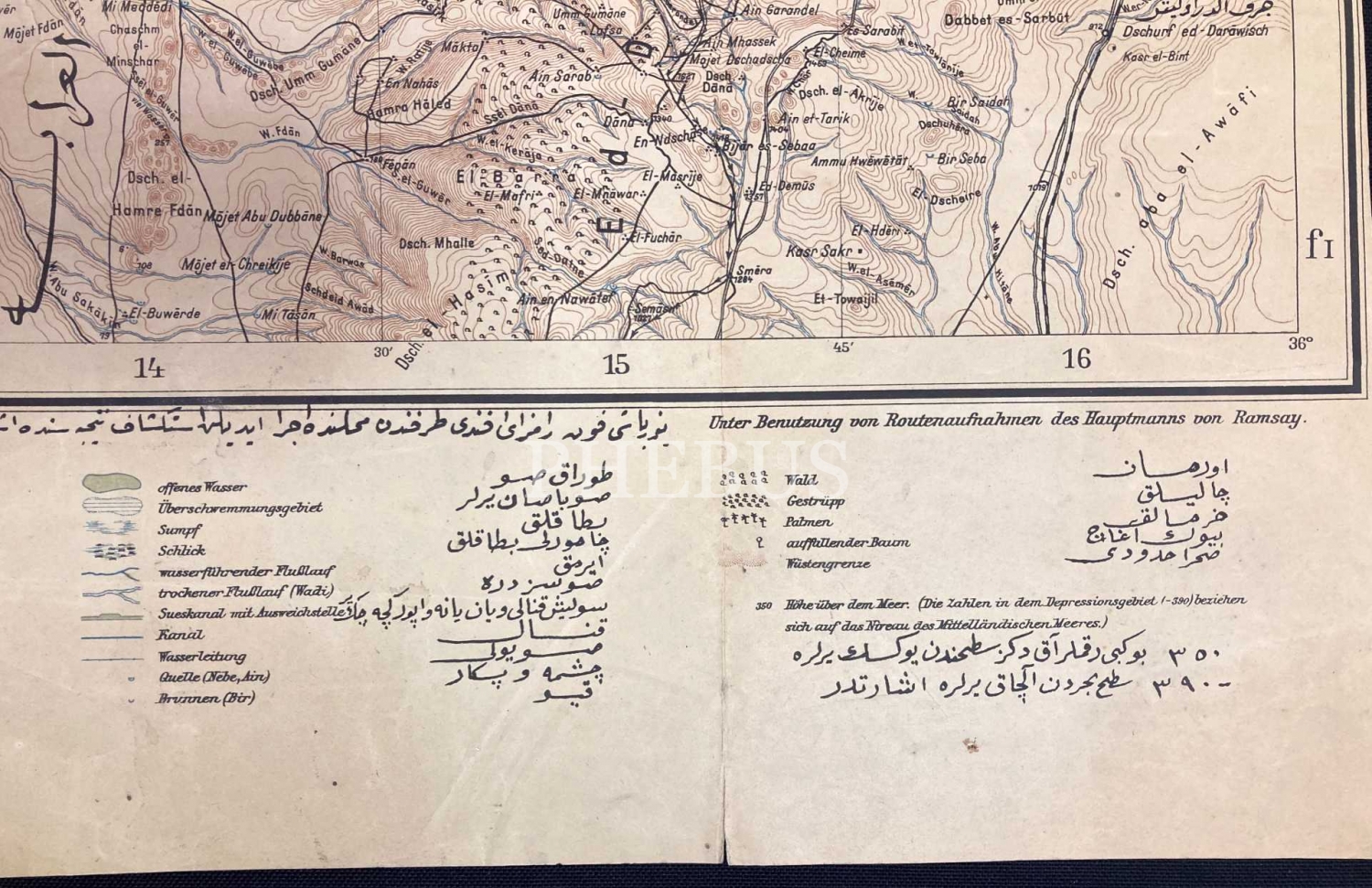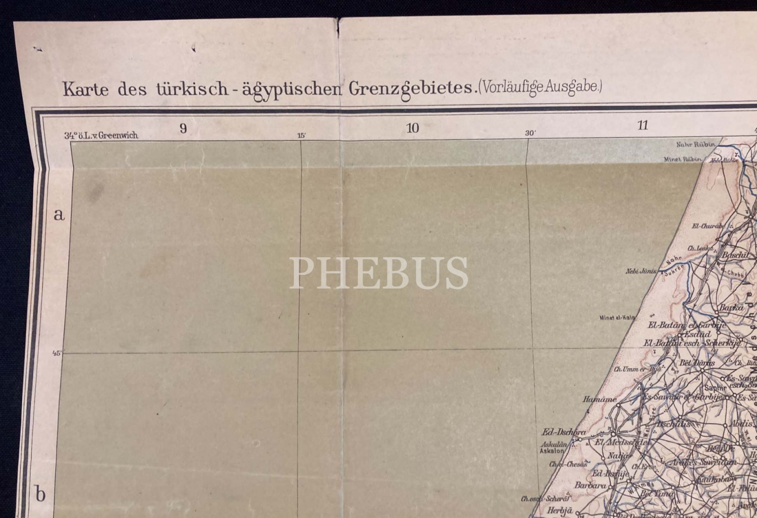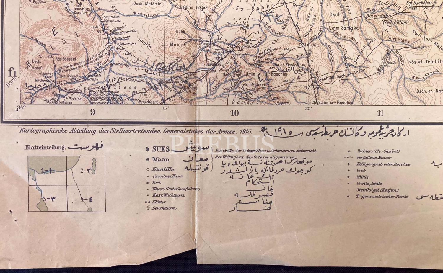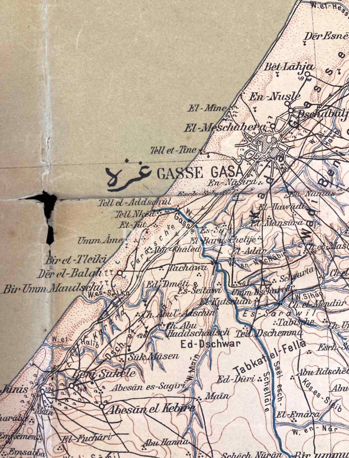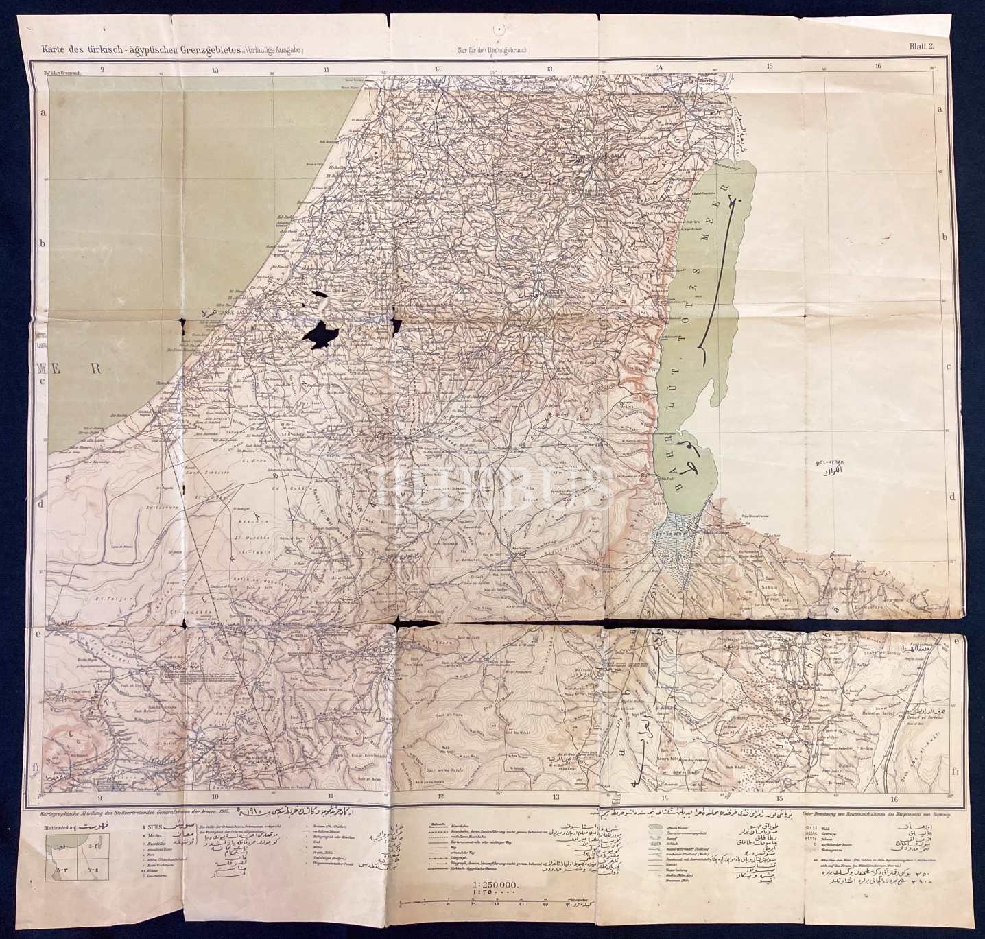Almanca Birinci Cihan Harbi'nde Ordu İçin Hazırlanmış Filistin-Gazze Haritası, Erkân-ı Harbiye Harita Dairesi Tarafından 1915'de üzerine Osmanlıca tercümesi yapılmış, yırtık hâliyle, 80x77 cm