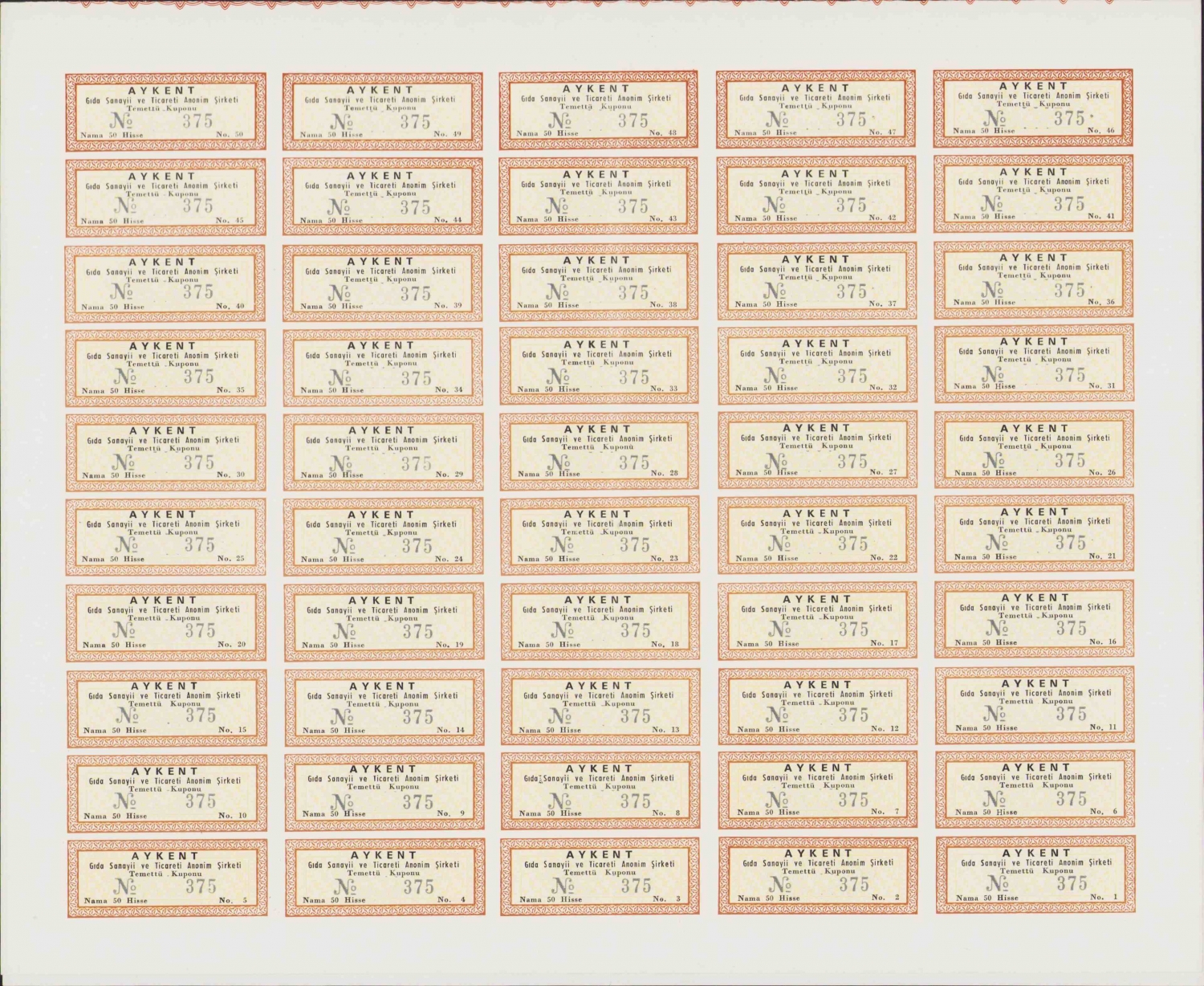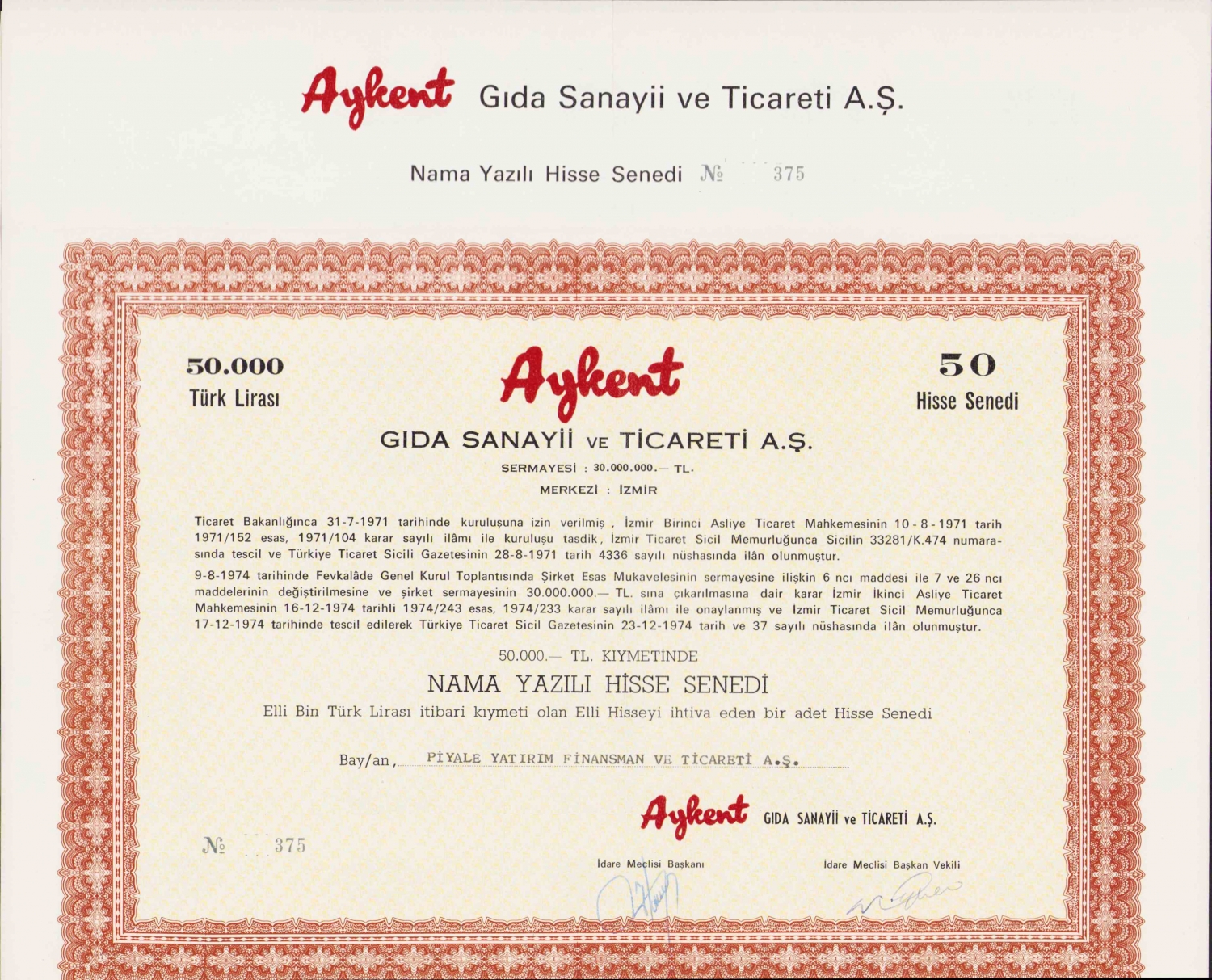 Aykent Gıda Sanayii ve Ticaret AŞ, İzmir adresli, hisse senedi, 50 bin tl, 34x54cm