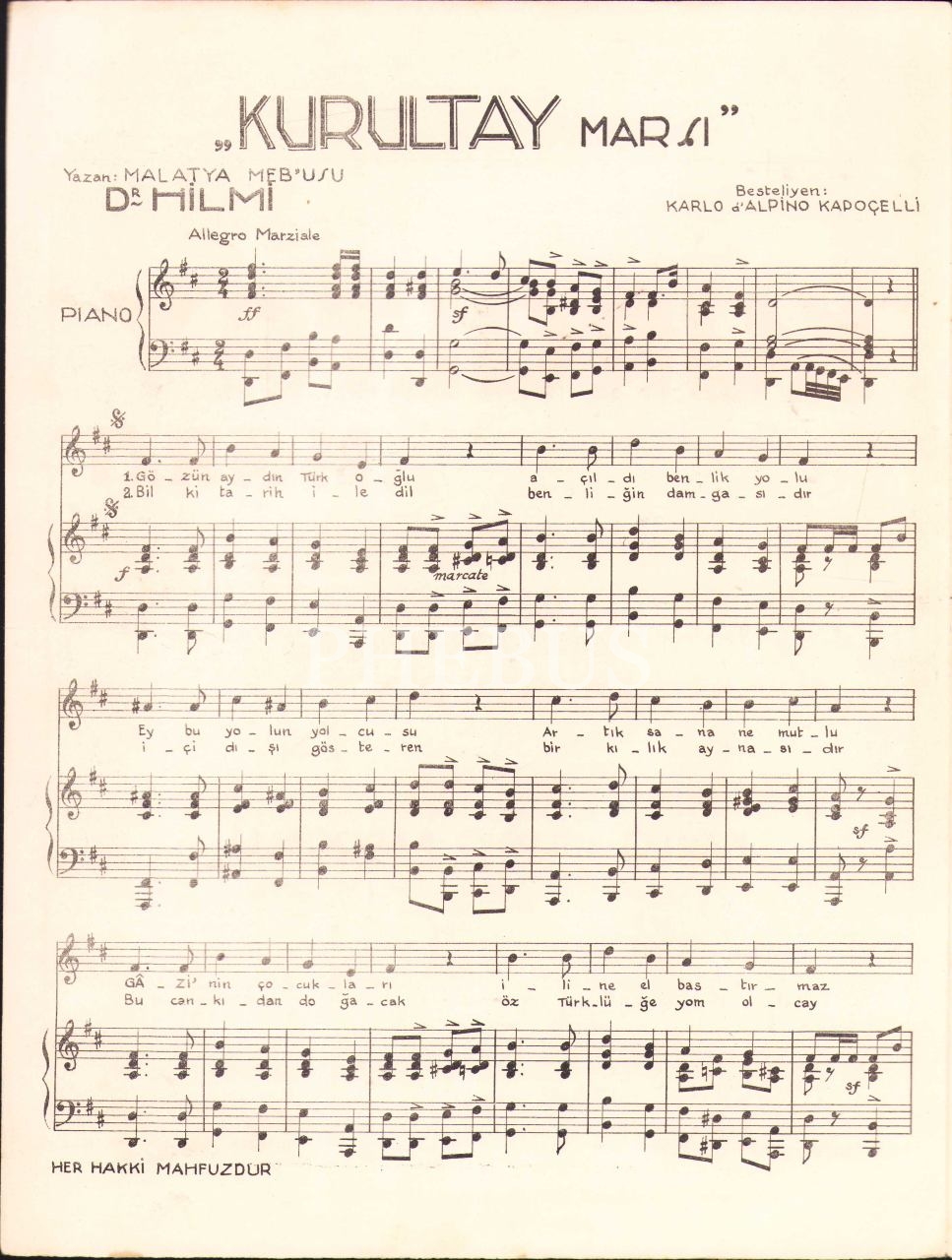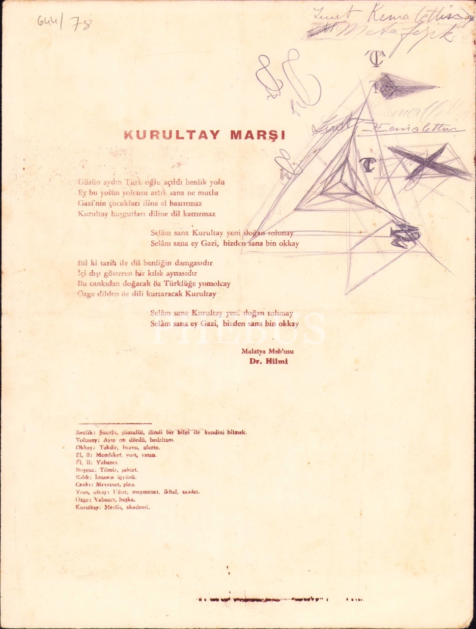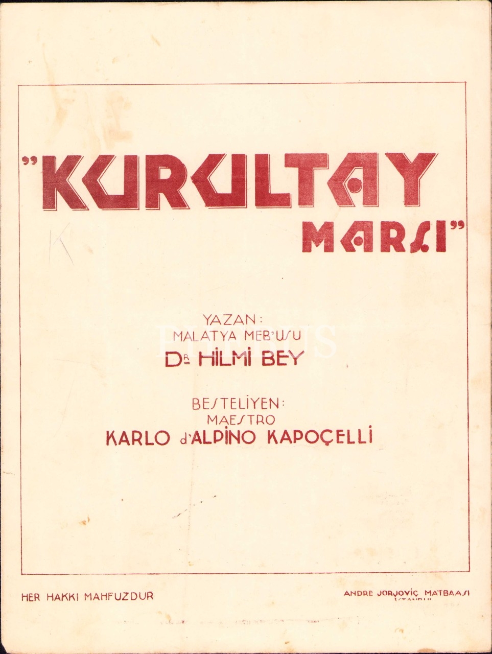 "Kurultay" Marşı, Yazan: Malatya Mebusu Dr. Hilmi Bey, Beste: Karlo d'Alpino Kapoçelli, Anre Jorjoviç, İstanbul, 25x32 cm