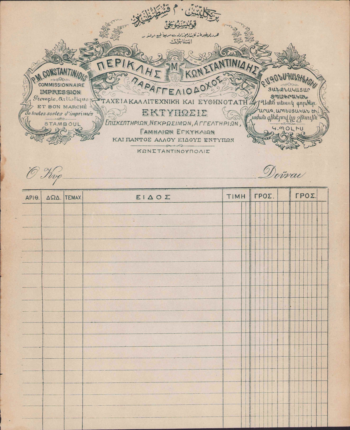 Periklis M. Konstantinidis Komisyoncu antetli 4 dilli fatura, 25x30cm
