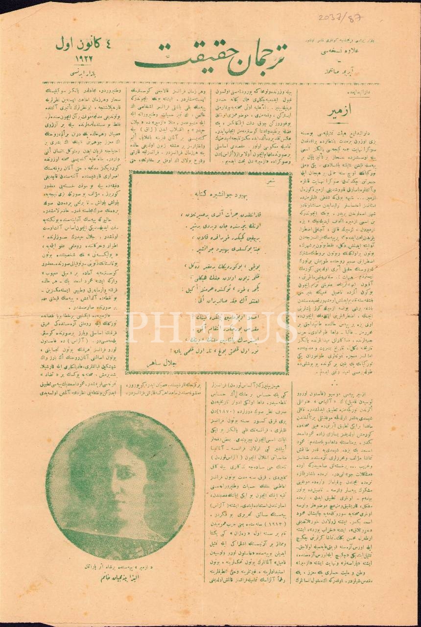 Osmanlı Tiyatrosunun Ermeni Sanatkârlarından Eliza Binemeciyan'ın Fotoğrafı Bulunan ve Darülbedayi'nin "İzmir" Piyesi Hakkında Bir Yazı Bulunan Osmanlıca Tercüman-ı Hakikat Gazetesi