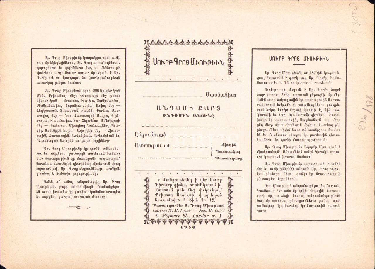 Ermenice Yazarlar Birliği Kitap Derneği Üye Kabul Kağıdı, 28x20 cm