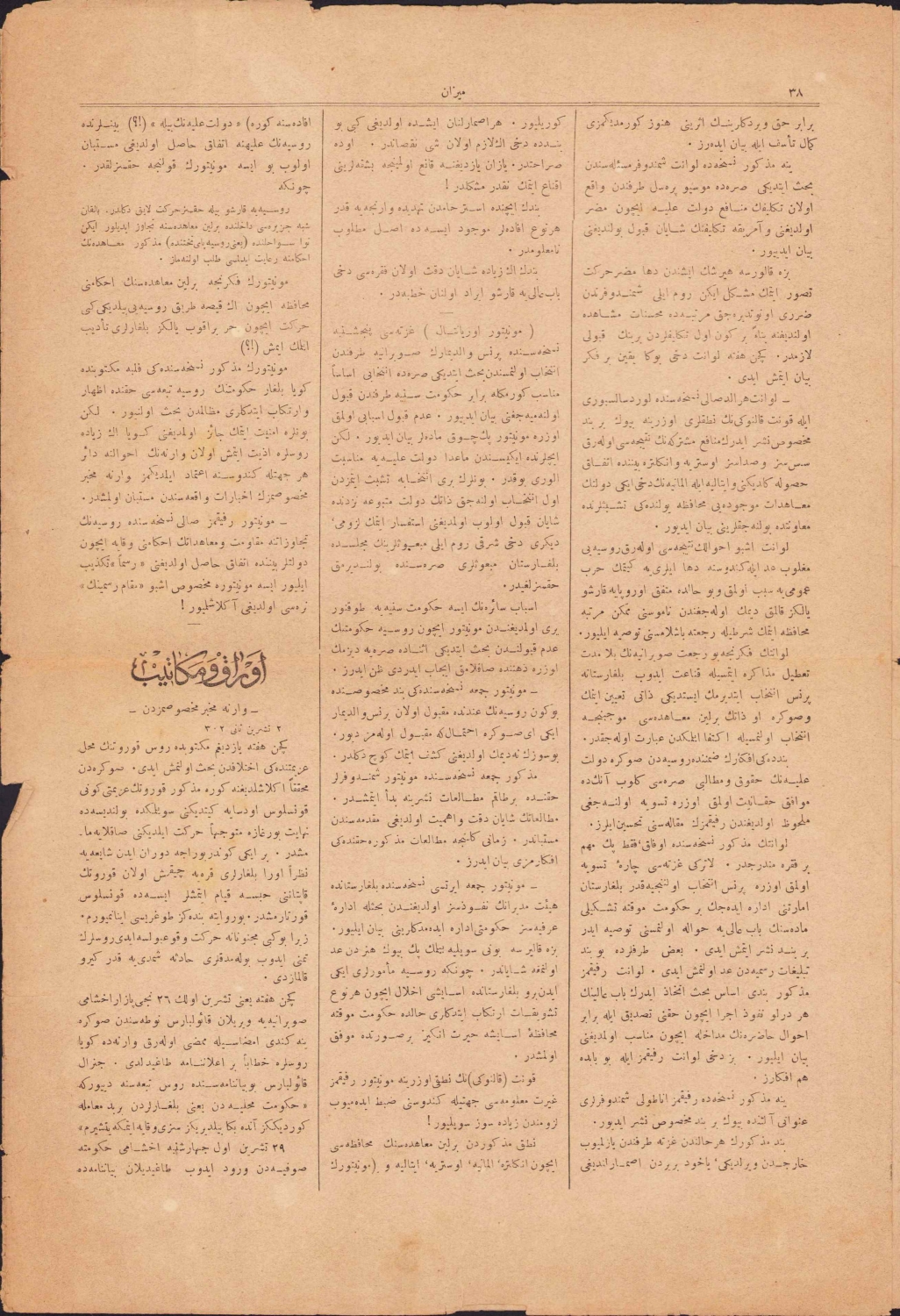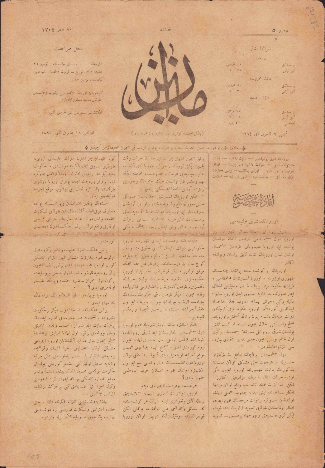 Osmanlı Mizan Gazetesi, 1304 tarihli, Osmanlıca, 4 sayfa, 28x40cm