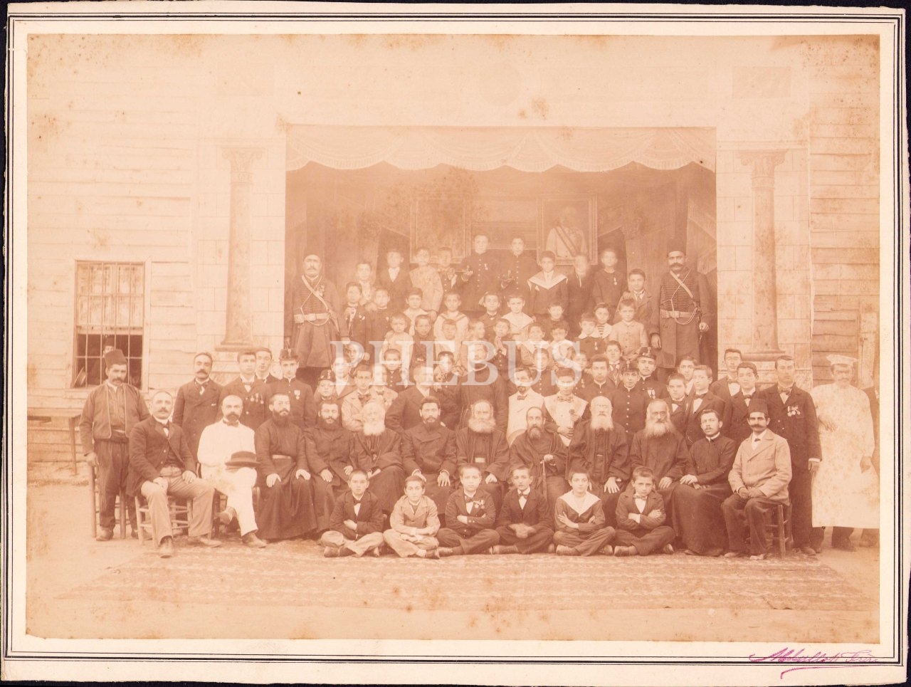 1893 Tarihli Bulgar İmparatoru Franz Joseph'in Portresi Önünde Poz Veren Azınlık Okulu Talebeleri ve Muallimleri, Abdullah Freres Islak İmzalı, 35x26 cm