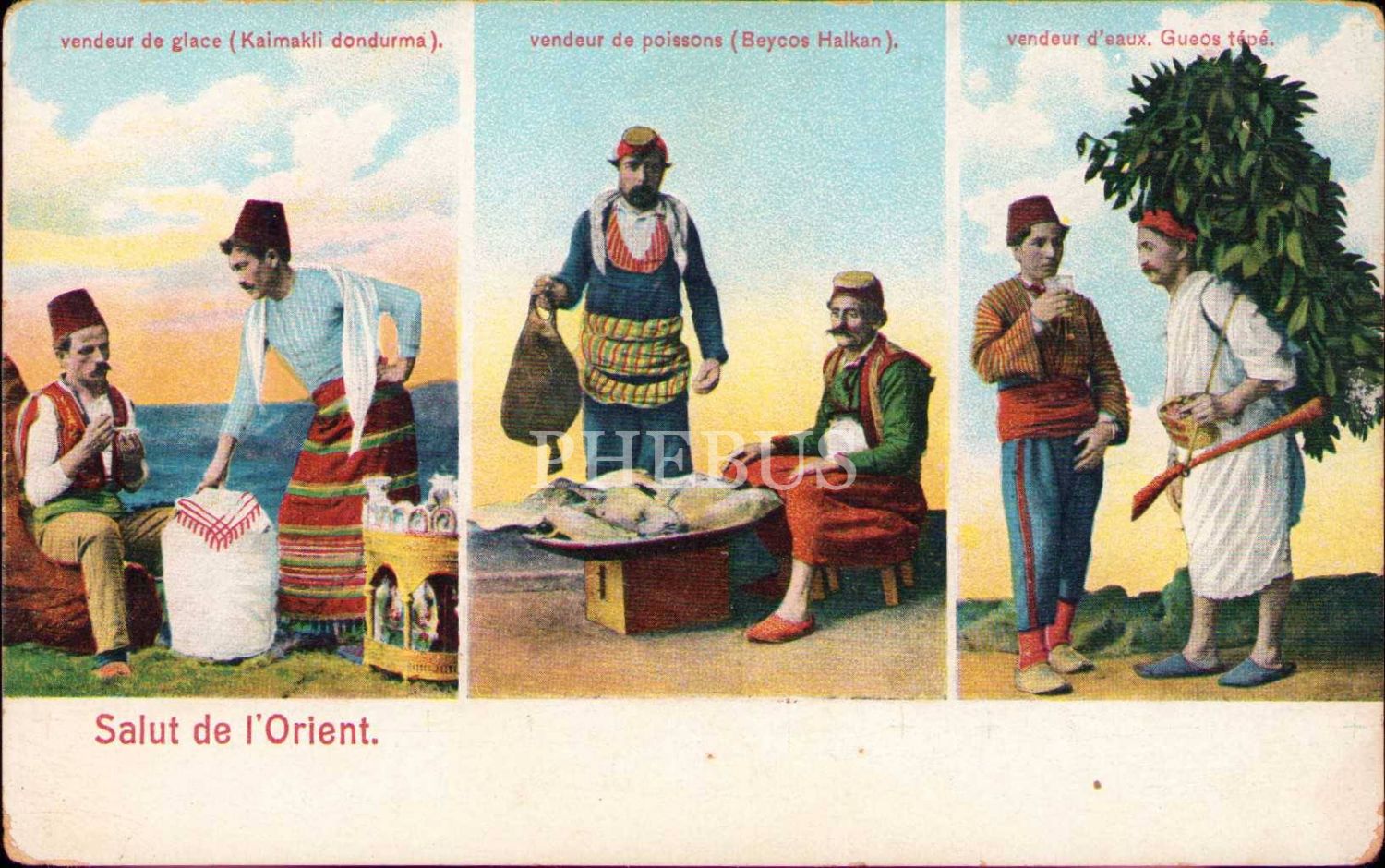 Osmanlı Dönemi Meslek Kartpostalı, Kaymaklı Dondurma, [Beycos] Balık ve Su Satıcısı [Gueos Tepe]