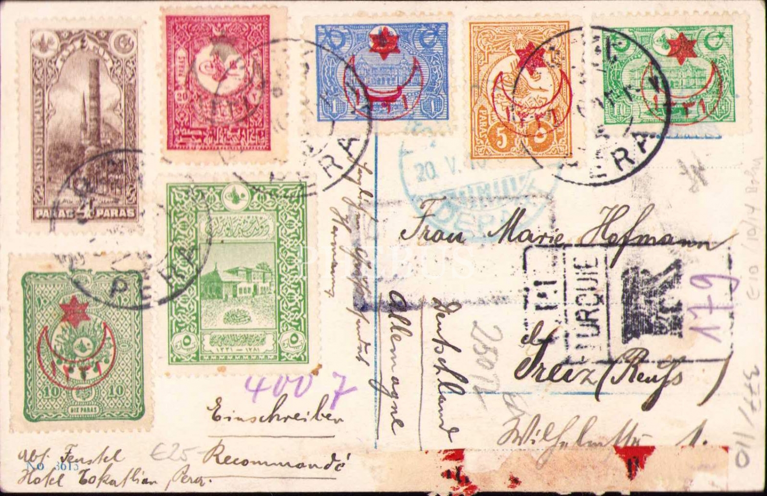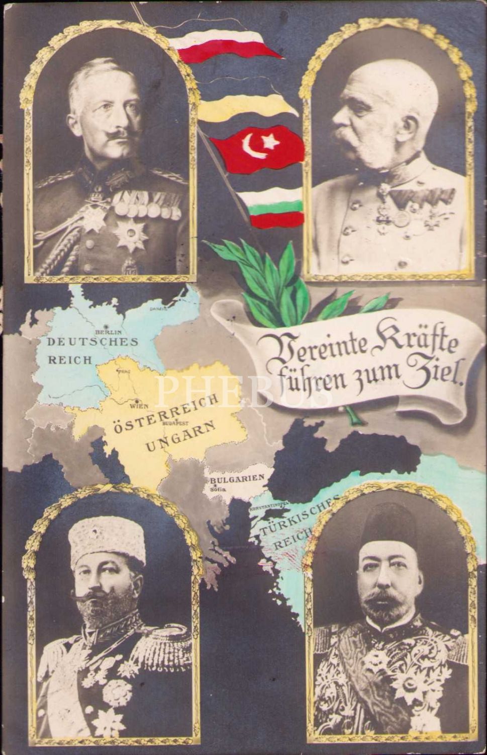 Birinci Cihan Harbi İttifak Kartpostalı, Osmanlı, Almanya, Avusturya ve Bulgaristan Hükümdarları, Sultan Mehmed Reşad görselli, postadan geçmiş, Pera damgalı