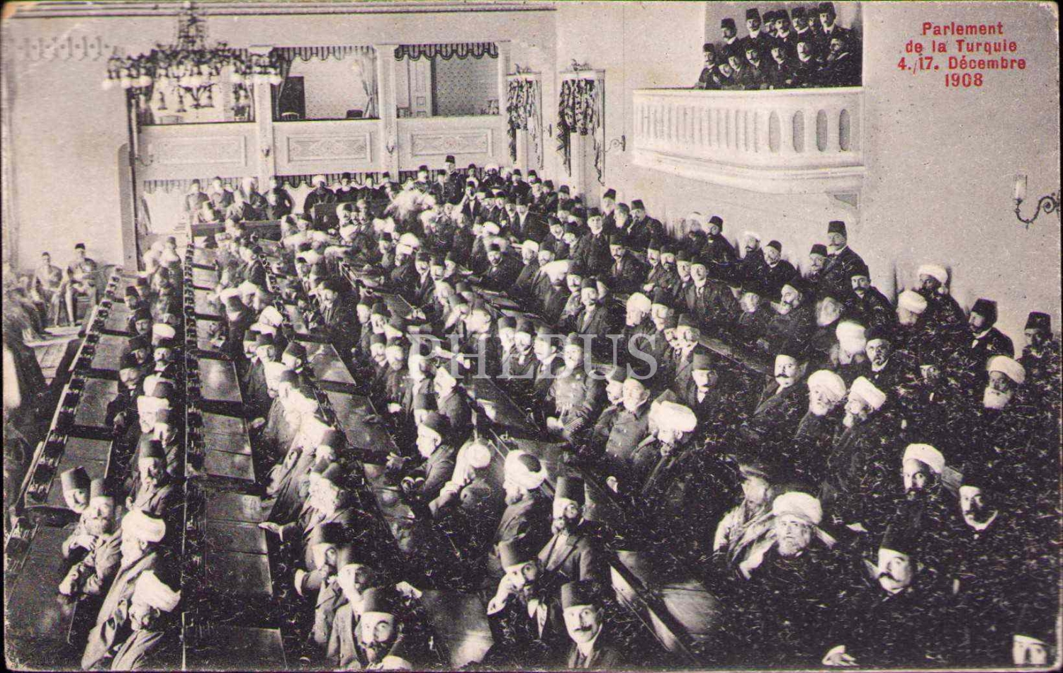 Osmanlı Dönemi Kartpostal, Meşrutiyet Esnasında [1908] Meclis-i Mebusan Meclisi, Fransızca "Parlament de la Turquie 4/17 Decembre 1908" yazılı