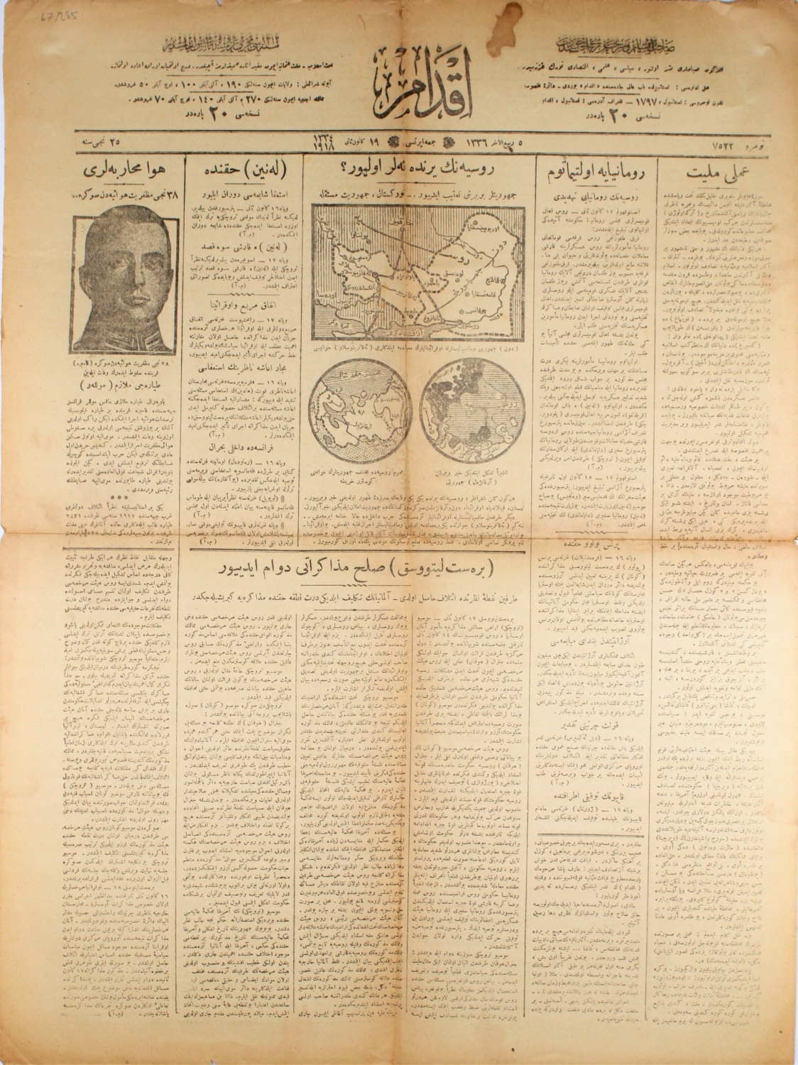 Osmanlı İkdam Gazetesi, 1336 tarihli, Osmanlıca, "Rusya'nın yerinde neler oluyor?" manşetli, "Lenin Hakkında", harita görselli, 45x60cm