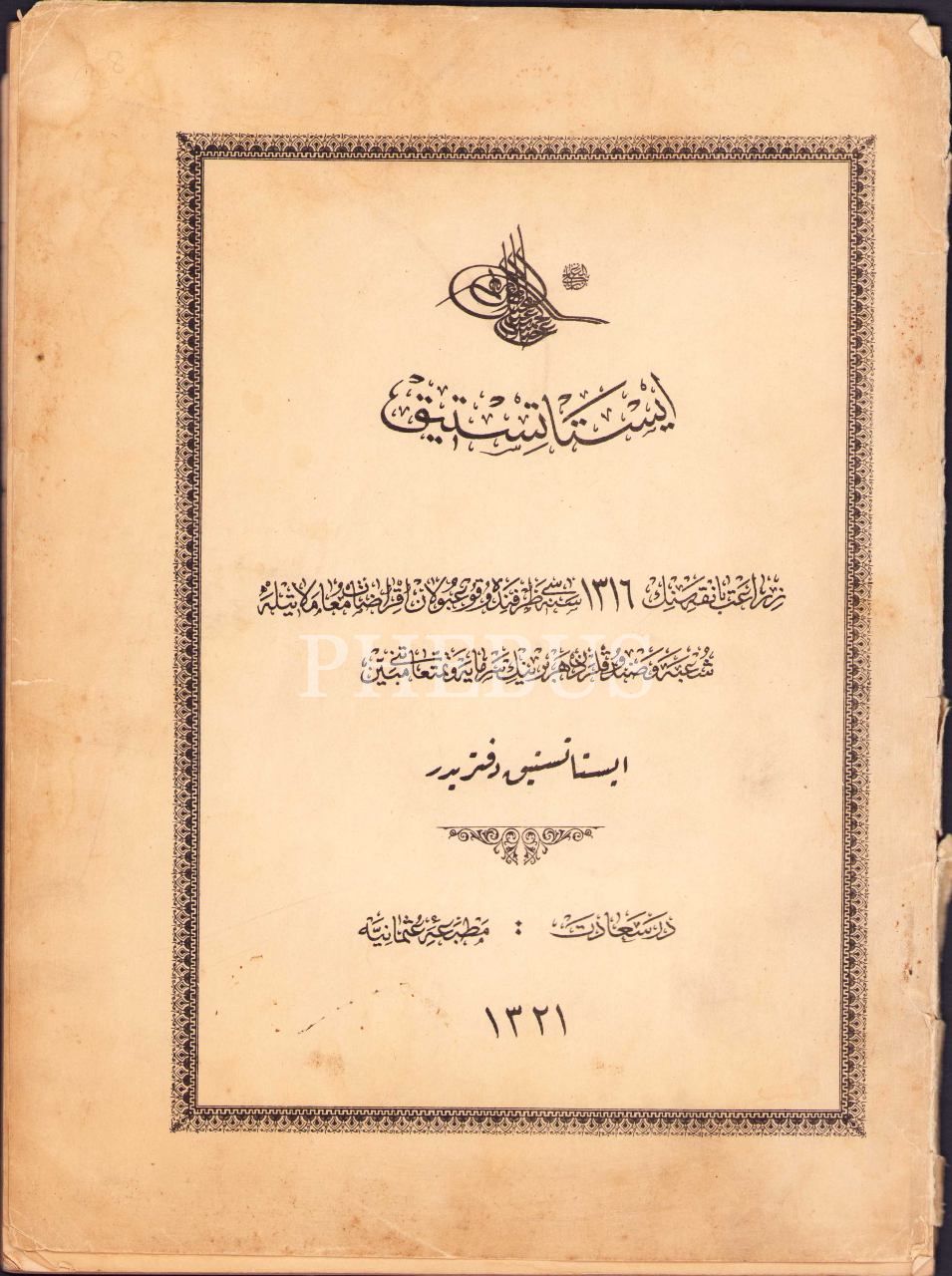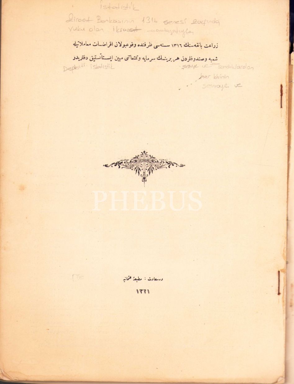 Osmanlıca Ziraat Bankası'nın 1316 Senesi Şube ve Sandıklarının Temettuat İstatistik Defteri, 1321 târihli, Dersaadet, Matbaa-i Osmaniye, 22 sayfa, 24x33 cm