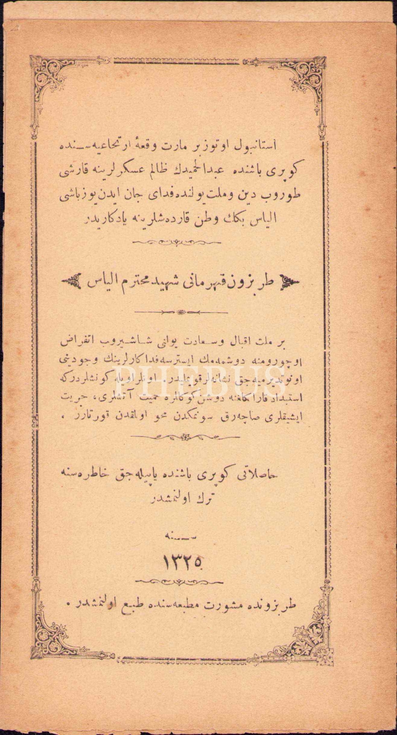 Trabzon Kahramanı Şehid-i Muhteremi İlyas, 1325 tarihli, Trabzon Meşveret Matbaası, 13 sayfa, Osmanlıca, 10,5x20 cm