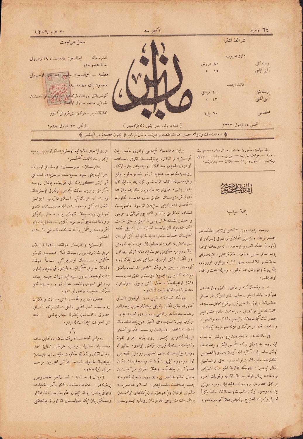Osmanlı Mizan Gazetesi, 1306 tarihli, Osmanlıca, haliyle, 12 sayfa, 28x40cm