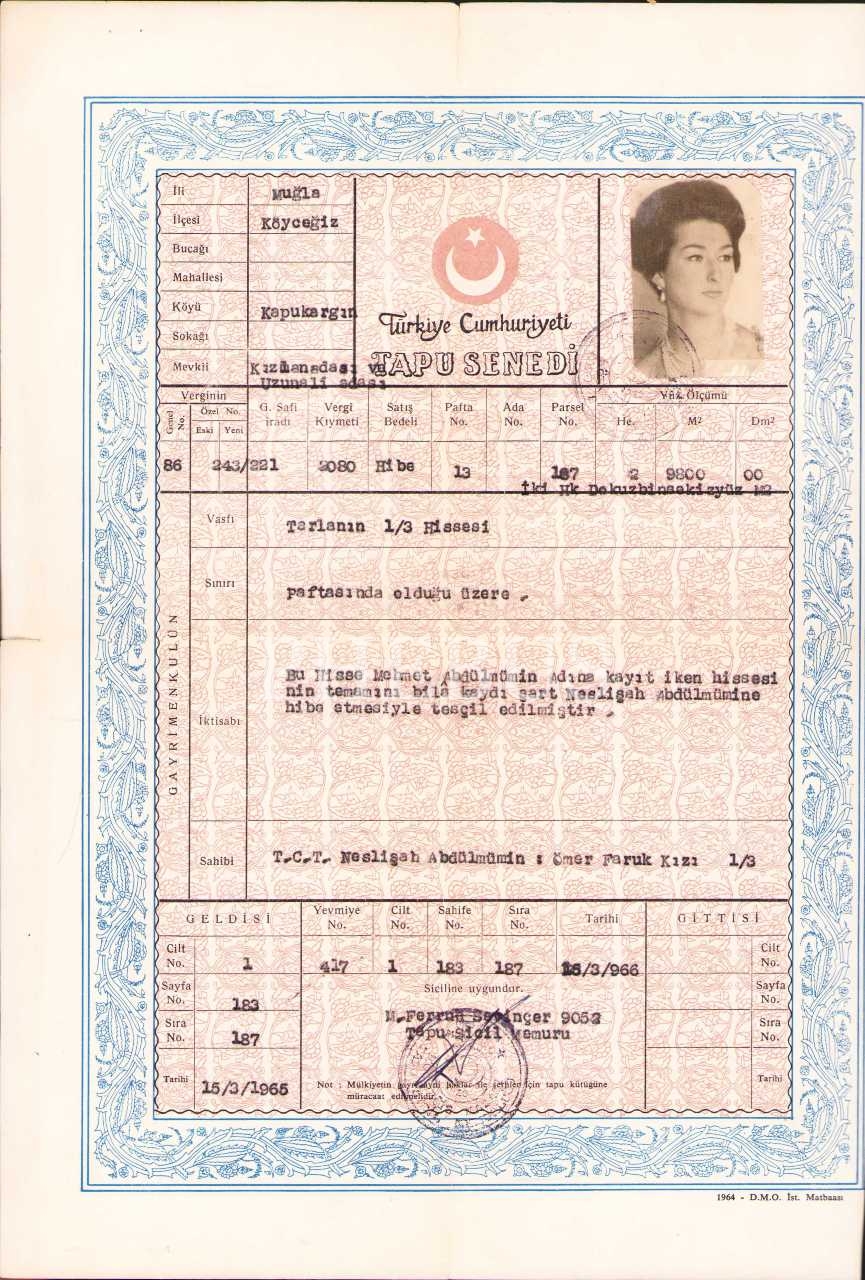 Son Osmanlı Sultanı Sultan Vahideddin'in ve Son Halife Abdülmecid'in Torunu Neslişah Sultan'a Ait Muğla Köyceğiz'de Tarla Tapusu, 1966 târihli, 23x34 cm