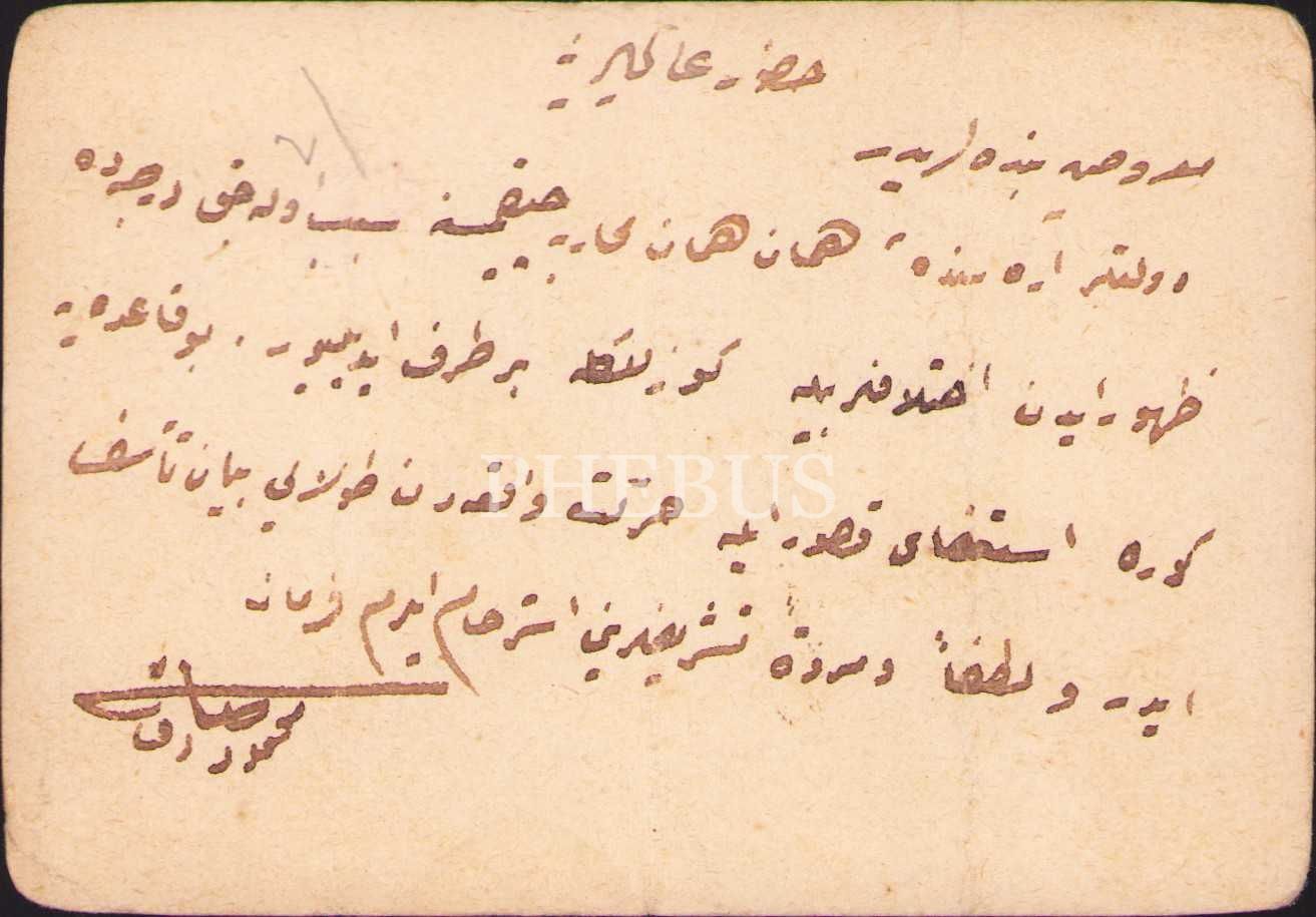"Şeyhü'l Muharirrin" [Yazarların Şeyhi] Ünvanıyla Bilinen Osmanlı'nın Son Dönem Gazeteci ve Yazarlarından Mahmud Sâdık Efendi'nin El Yazısıyla Yazılmış Osmanlıca Arz-ı Hâl, "Huzur-ı Âlilerine" şeklinde, Mahmud Sâdık imzalı, 12x7 cm