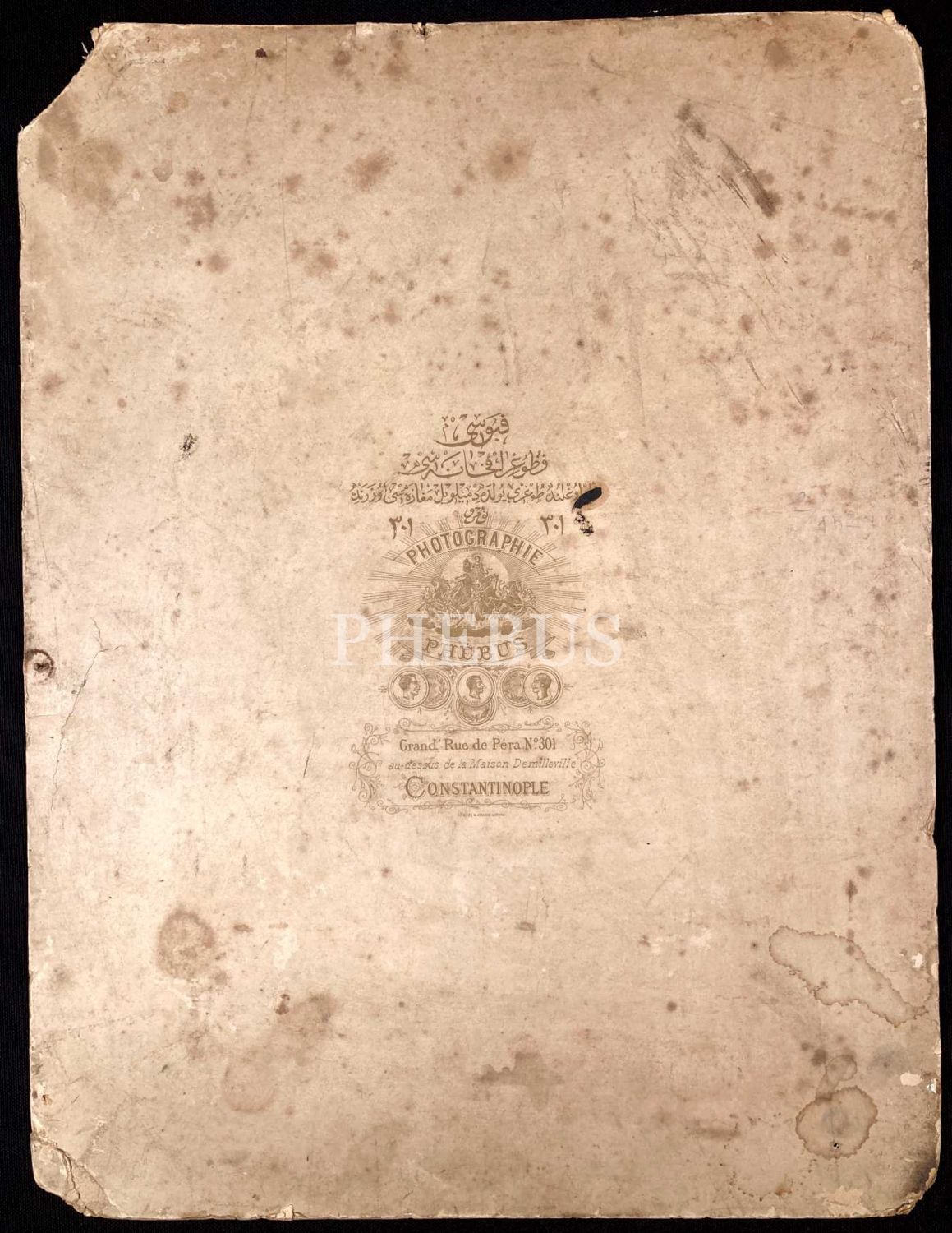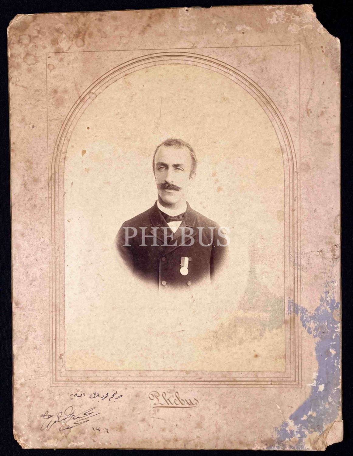 Osmanlı İmparatorluğunun Son Halifesi Abdülmecid Efendi'nin Mahmud Sâdık Bey'e İthafen İmzalığı Kabin Fotoğrafı, 1306 târihli, Phebus Fotoğrafhanesi, kenarları hâliyle, 32x42 cm