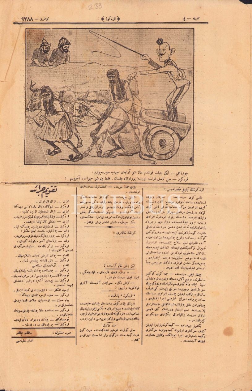 Osmanlıca karikatürün altında, "Karagöz- Harmanın civcivli zamanı Paşam. Kıvamı gelse de samanını beraber savursak." yazılıdır.
