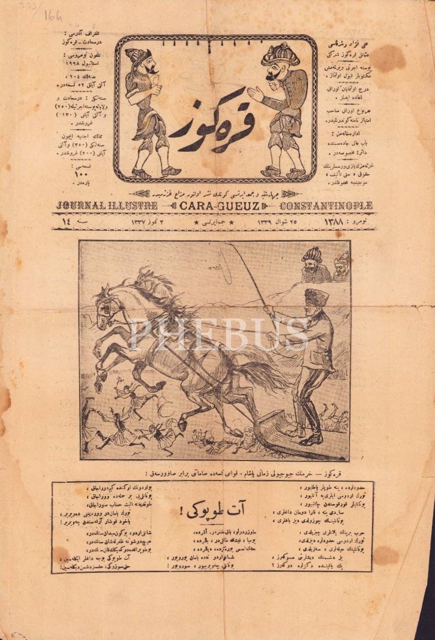 Osmanlıca "Karagöz" Mizah Mecmuası, Mustafa Kemal Atatürk'ü Yunan Ordusunu Mağlup Ederken Tasvir Edilmiş Karikatürü Manşetli, 25 Şevval 1339, 4 sayfa, hâliyle 30x40 cm
