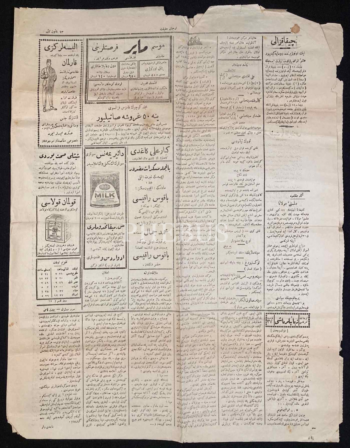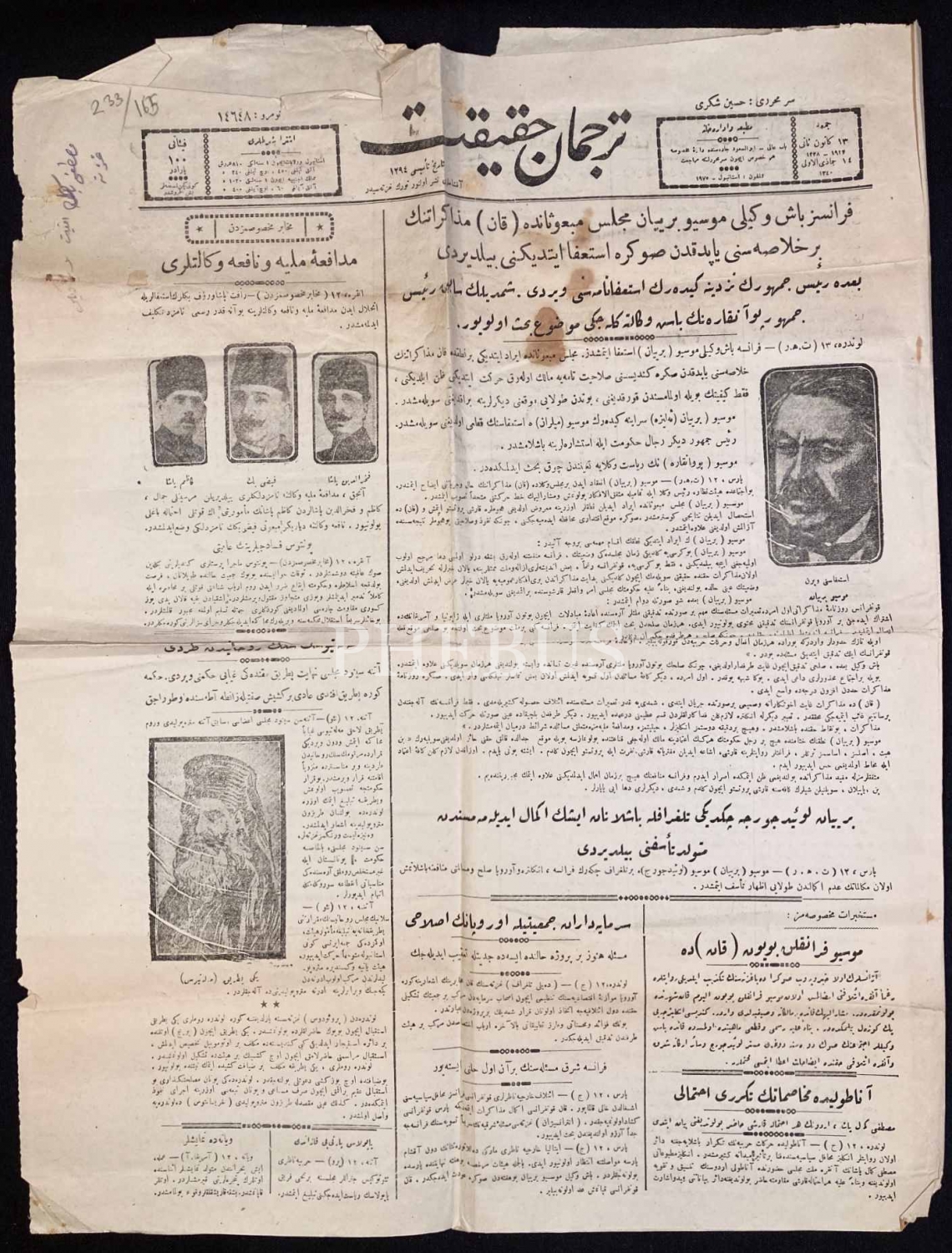Osmanlıca "Tercüman-ı Hakikat" Gazetesi, Müdafaa-i Milliye ve Nafia Vekaletleri ve İstifa Eden Fransa Başbakanı Mösyö Briyan Manşetli, 1340 târihli, 4 sayfa, 40x55 cm