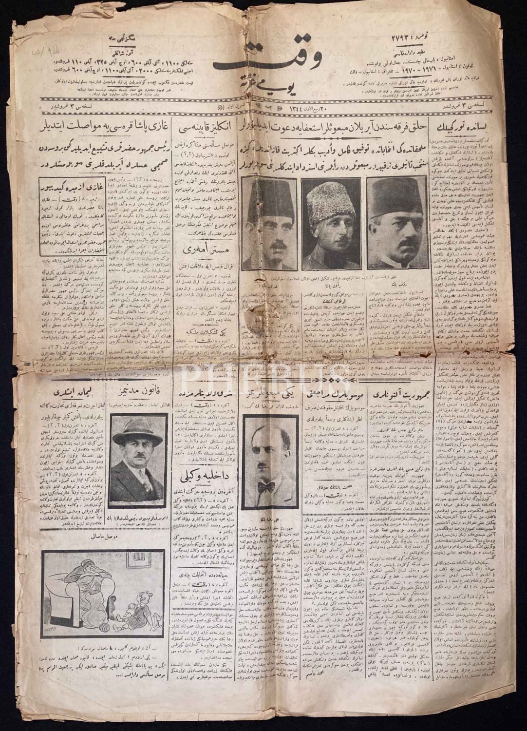 Osmanlıca "Vakit" Gazetesi,"Gazi Paşa Karesi'ye Muvasalat Etdiler [Ulaştılar]" ve "Halk Fırkasından Ayrılan Mebuslar İstifaya Davet Ediliyor" Manşetli, 1925 târihli, 6 sayfa, 40x62 cm