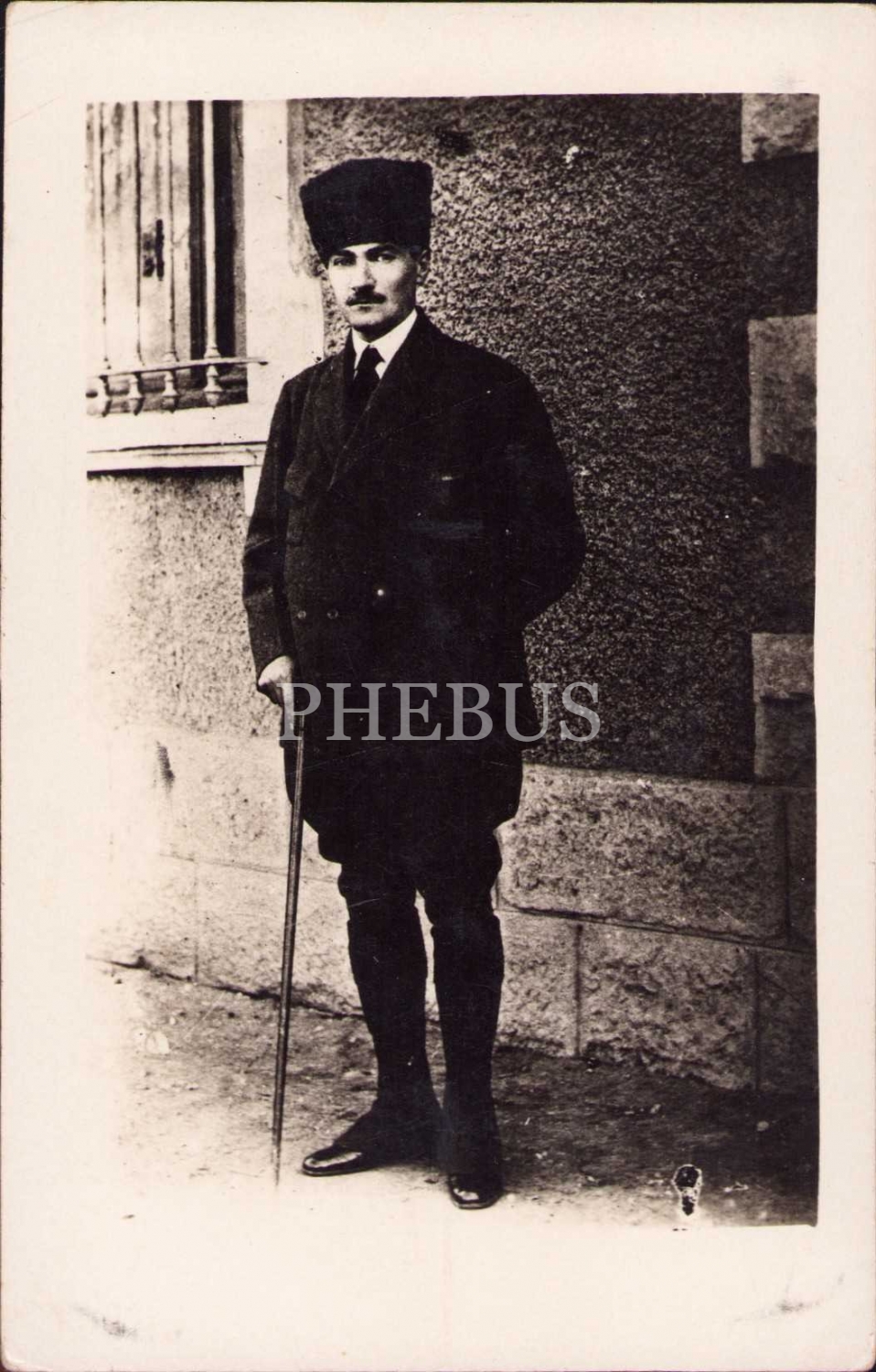 Mustafa Kemal Atatürk kalpak ve bastonuyla, 9x15 cm