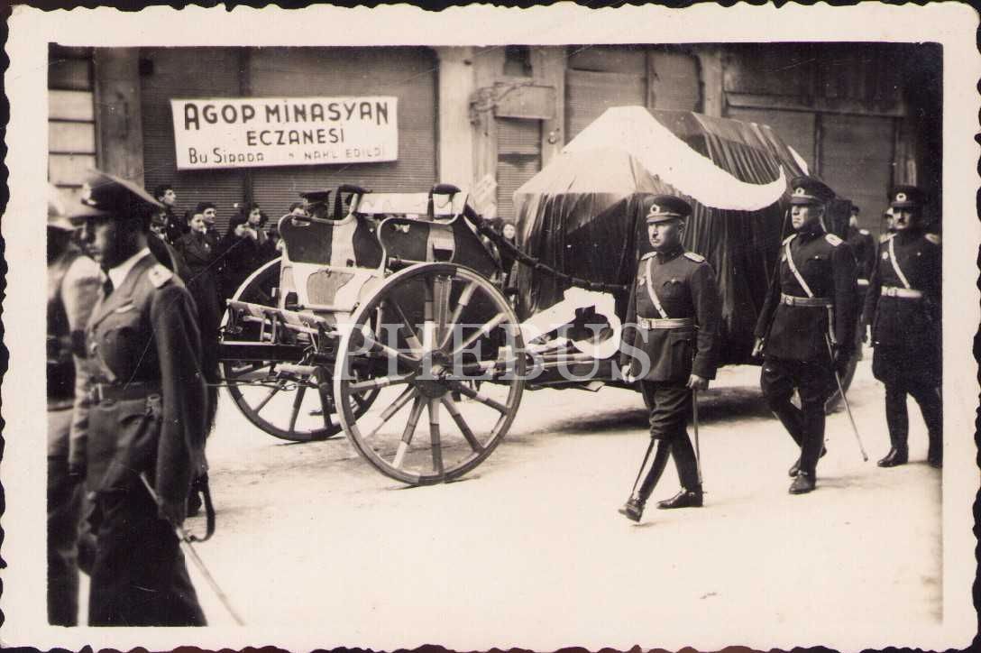 Mustafa Kemal Atatürk'ün Cenâze Merasimi, arkada "Agop Minasyan Eczanesi" yazılı tabela gözükmekte, 9x7 cm