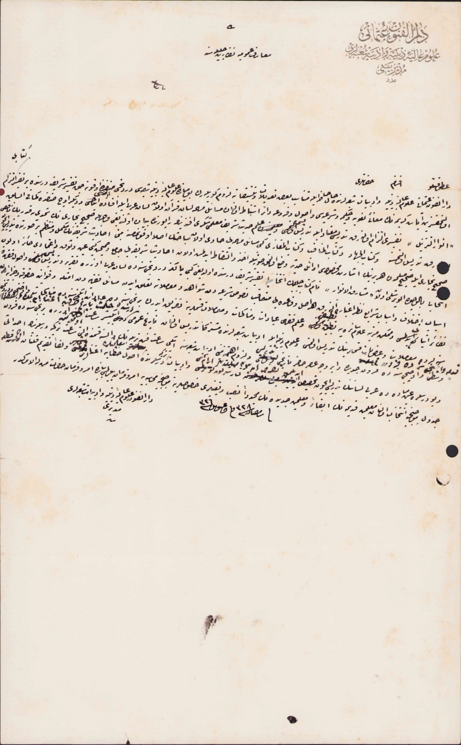 Osmanlı 1326 tarihli Darülfünun Osmaniye Ulum-ı aliye diniyye ve edebiyye şubeleri müdiriyetinden yazılan resmi evrak, 20x32cm