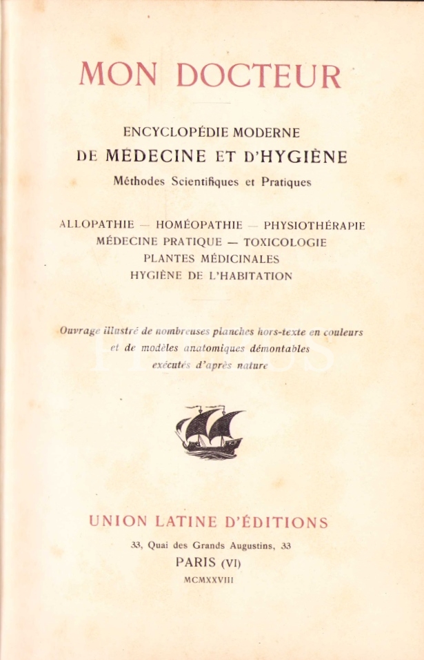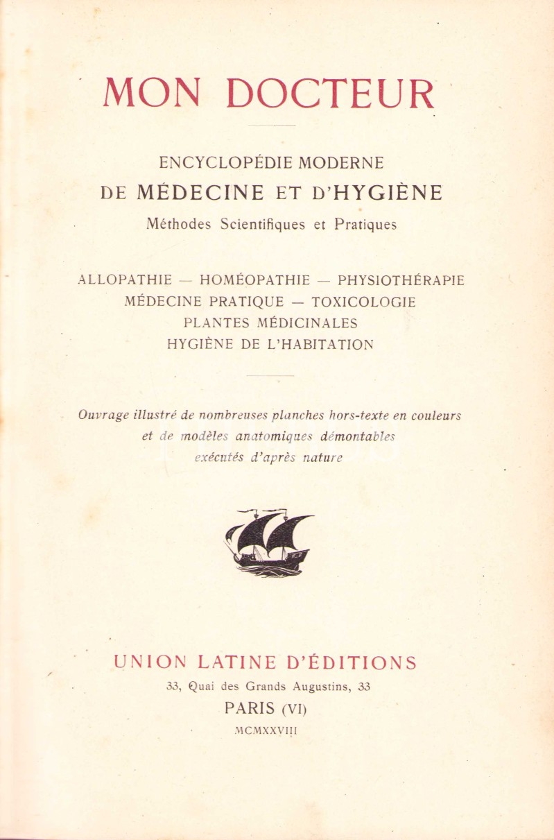 Fransızca Mon Docteur [Doktorum Modern Hijyen ve Sağlık Ansiklopedisi], İki Cild, Paris, Union Latine d'Editions, iç kapaklarda erkek ve kadın vücudunu anlatan katlanabilir şemalar mevcut, 18x25 cm