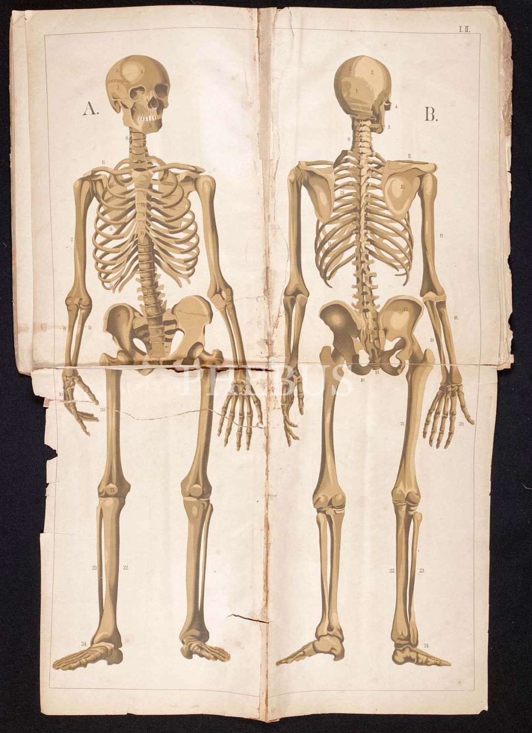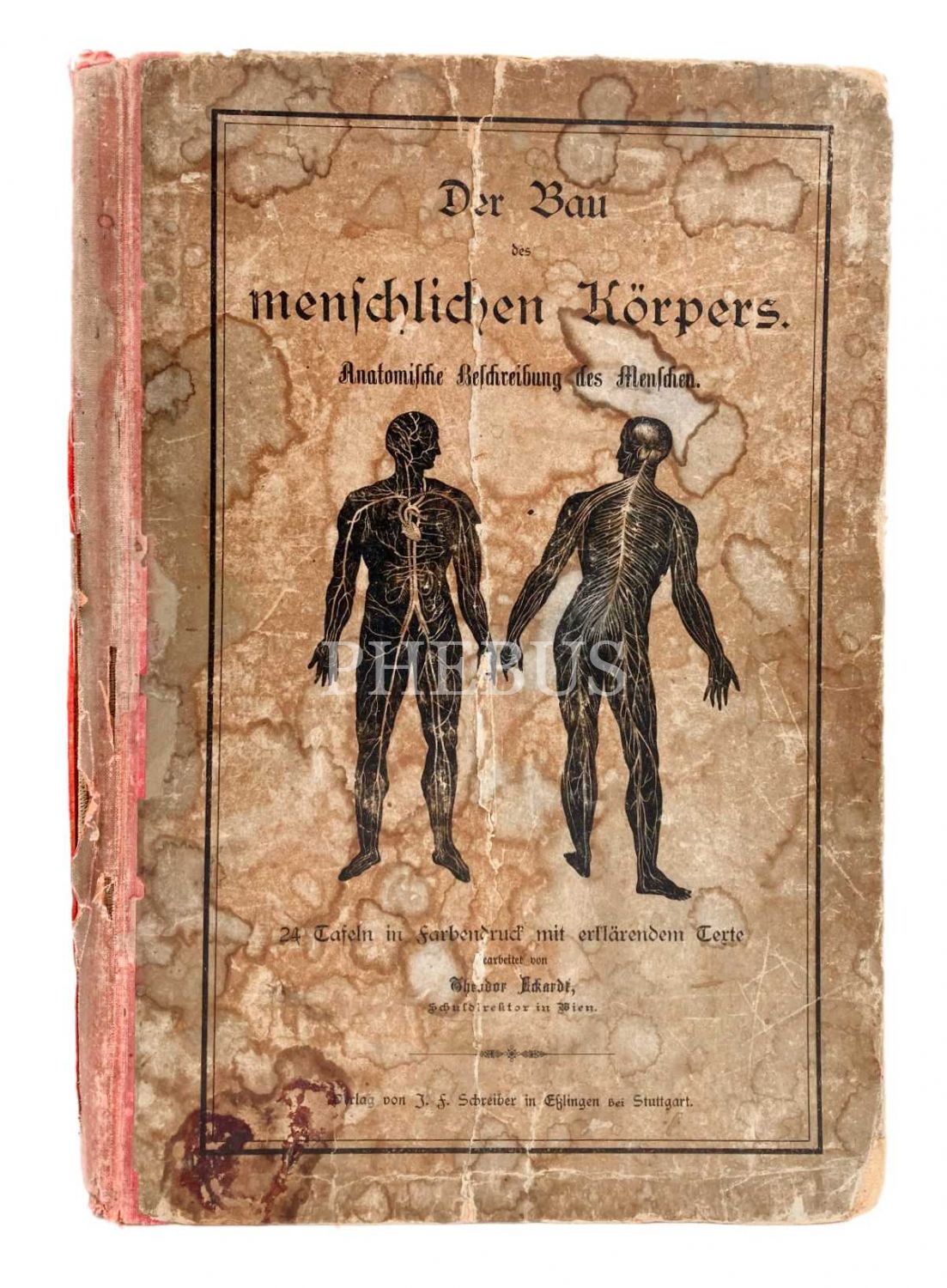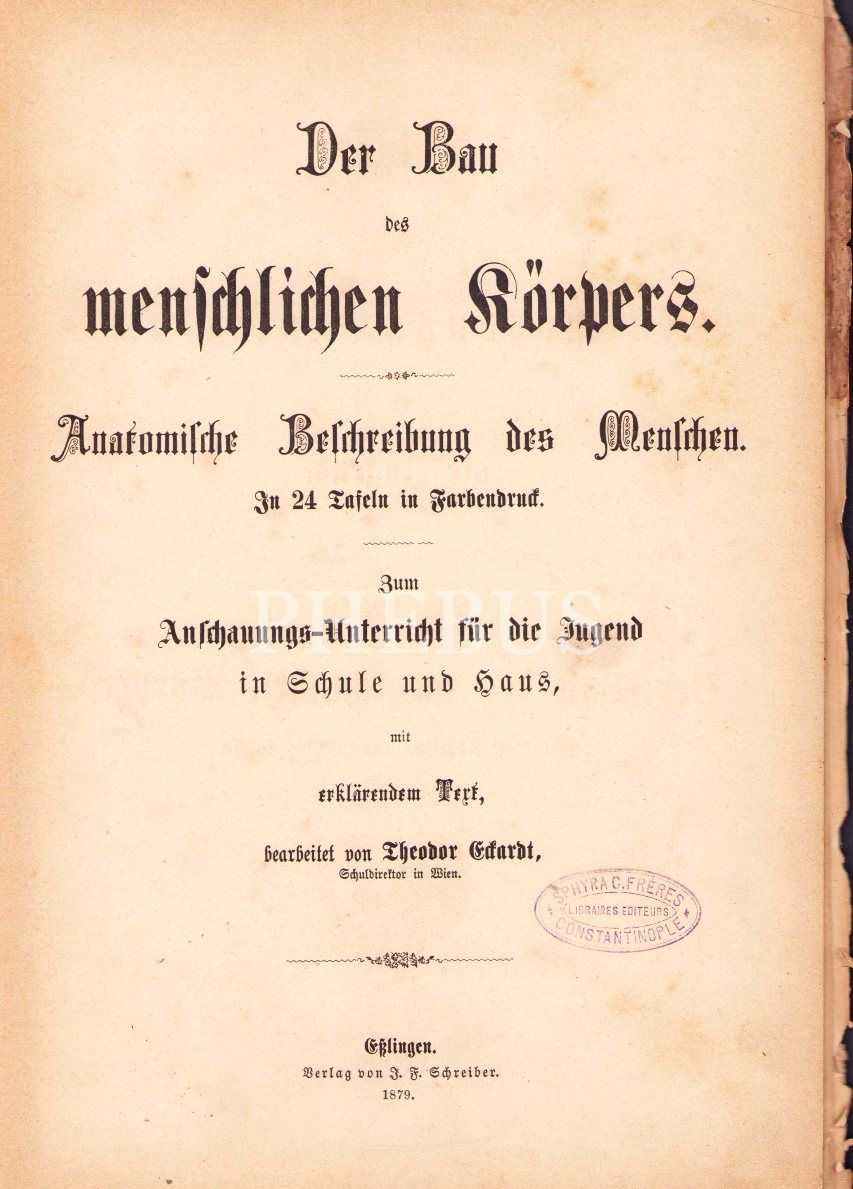 Almanca Bir Anatomi Kitabı: Der Bau des Men Lihchenkörpers [Erkek Vücudunun Yapısı], Thodor Edardt, 1879, Sphyra C. Freres Constantinople damgalı, 23 sayfa+23 görsel mevcut, oldukça yıpranmış hâlinde, 23x33 cm
