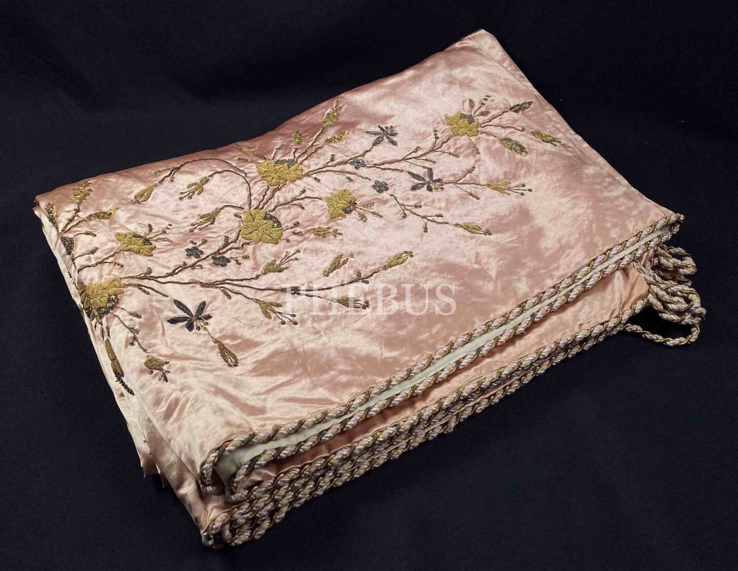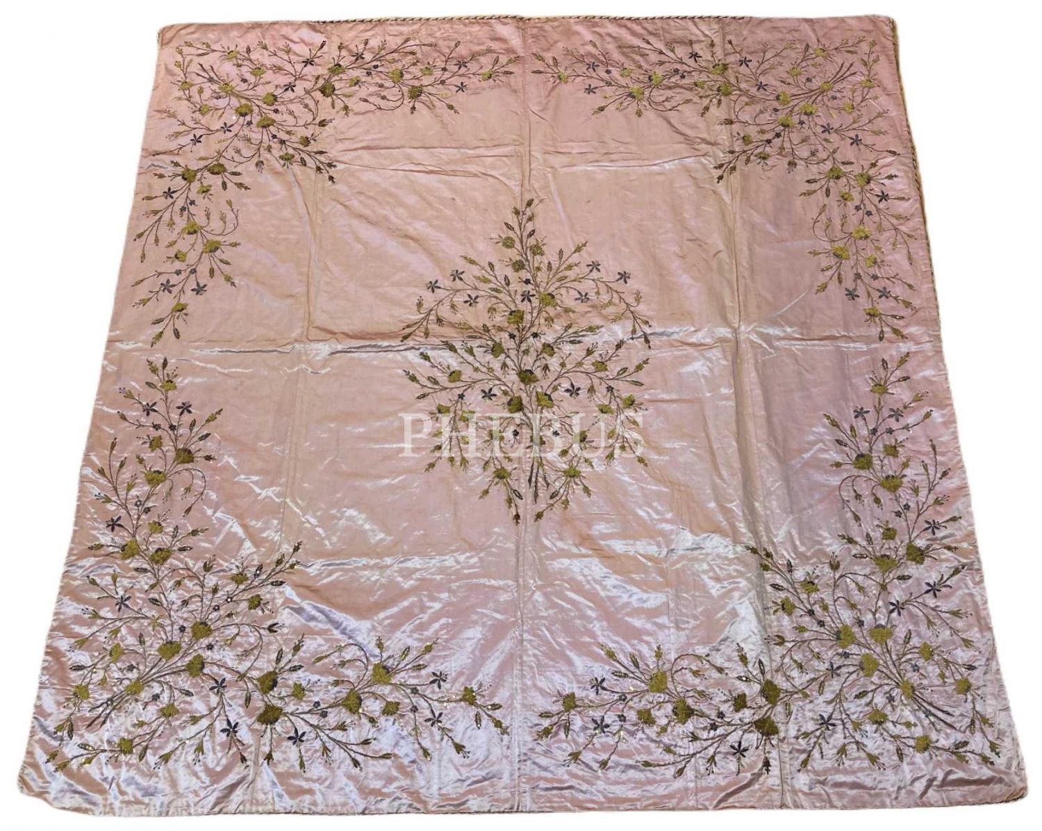 İstanbul İşi Pembe Atlas Üzerine Sim İşlemeli Bitkisel Motiflerle Bezeli Minik Pul ve Taşlarla Süslü Çevresi Zırhlı Çeyiz Yatak Örtüsü, çil kondisyonda, 198x198 cm