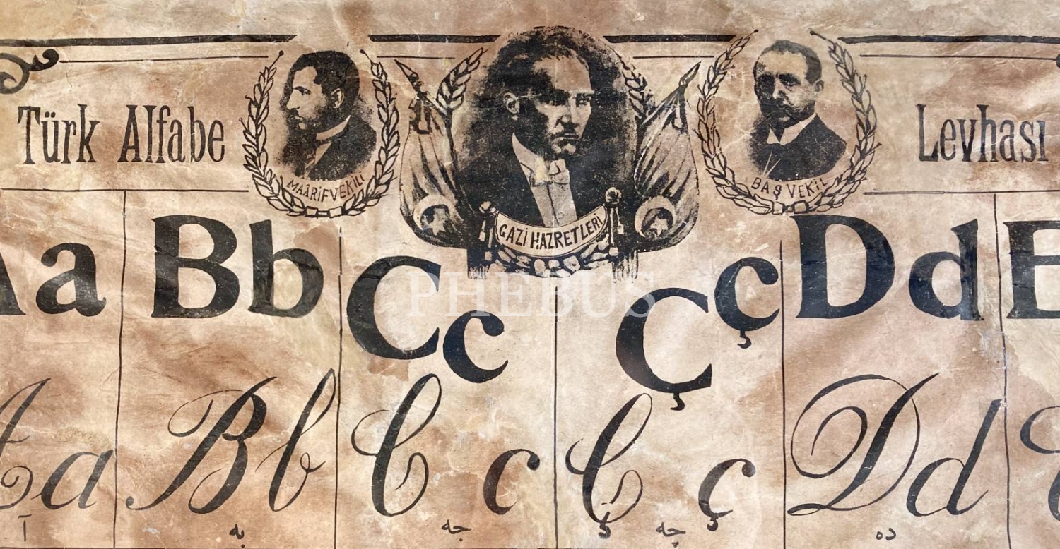 Harf İnkılabı Esnasında Yayınlanan Osmanlıca ve Latin Harfli Türk Alfabe Levhası, Mustafa Kemal Atatürk, Baş Vekil İsmet İnönü ve Maarif Vekili Necati Bey görselli, sadece afiş 45x65 cm, restore edilmiş haliyle