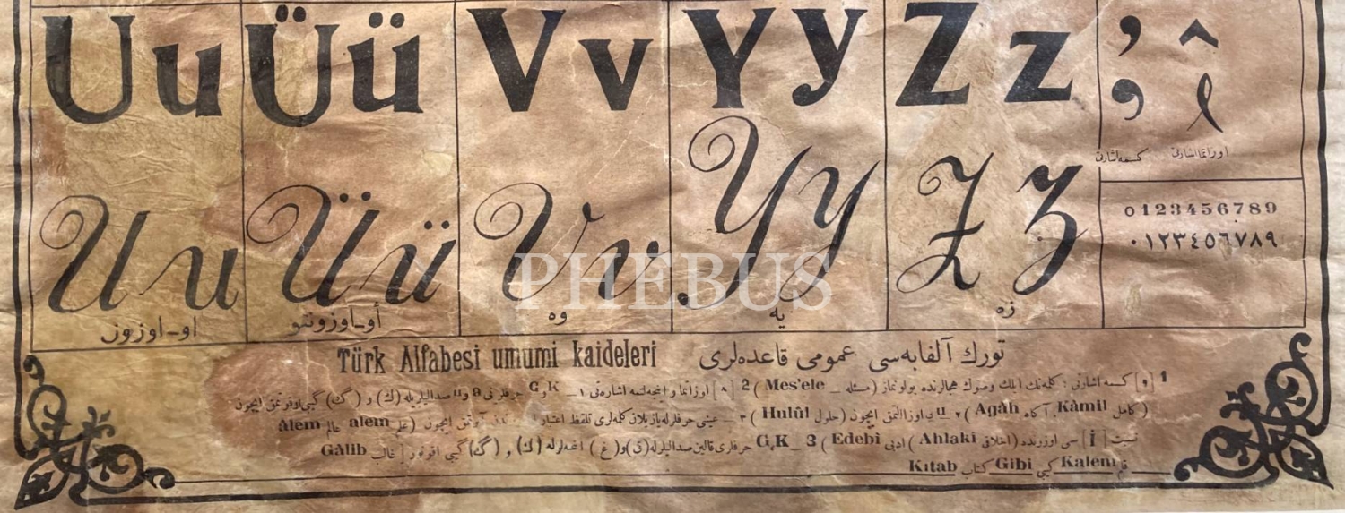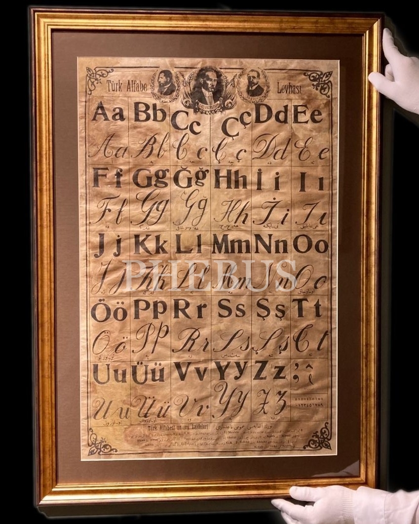 1928 yılındaki harf inkılabı esnâsında yayınlanan Türk Alfabe Levhası'nda Osmanlıca harflerin latin harfli karşılıkları verilmiştir. Harflerin yanında sayıların da karşılıkları verilmiştir. Alt kısımda da umumi kaideleri bölümü yer almaktadır.