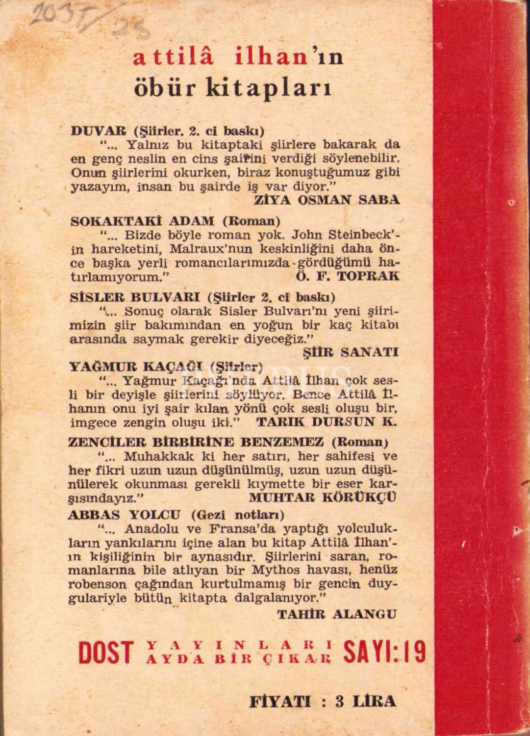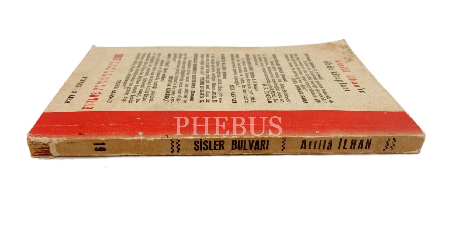 "Sisler Bulvarı -Şiir-", Attila İlhan, Dost Yayınları, İkinci Baskı 1960, 137 sayfa, sırt kısmı ve ön kapağı yıpranmış haliyle, 11x16 cm