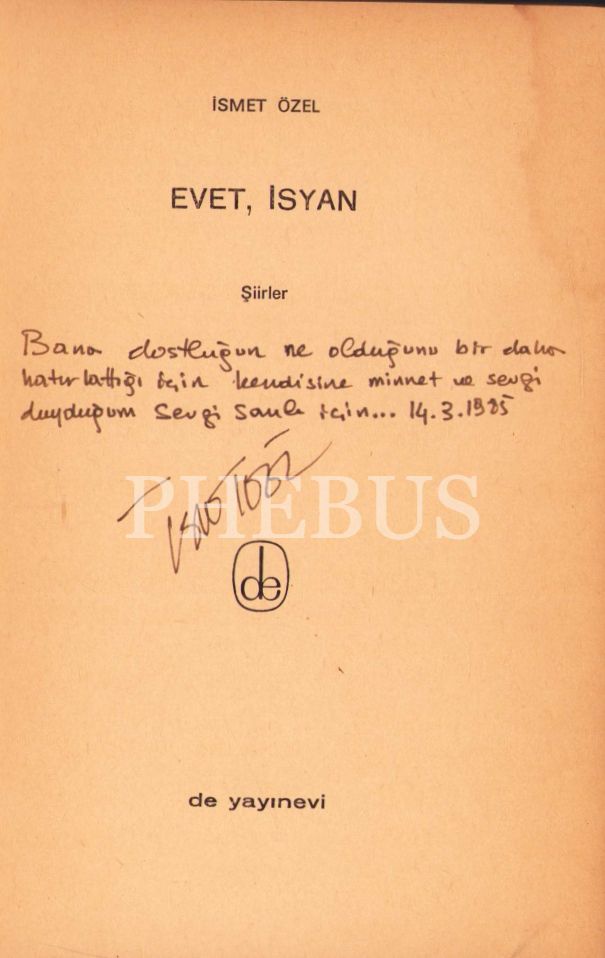 İsmet Özel'den Sevgi Sanlı'ya İthaflı ve İmzalı "Evet İsyan -Şiir-", De Yayınevi, İlk Baskı 1969, 43 sayfa, kapağı yorgun haliyle, 13x19 cm
