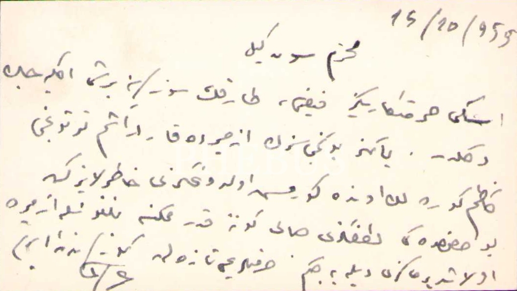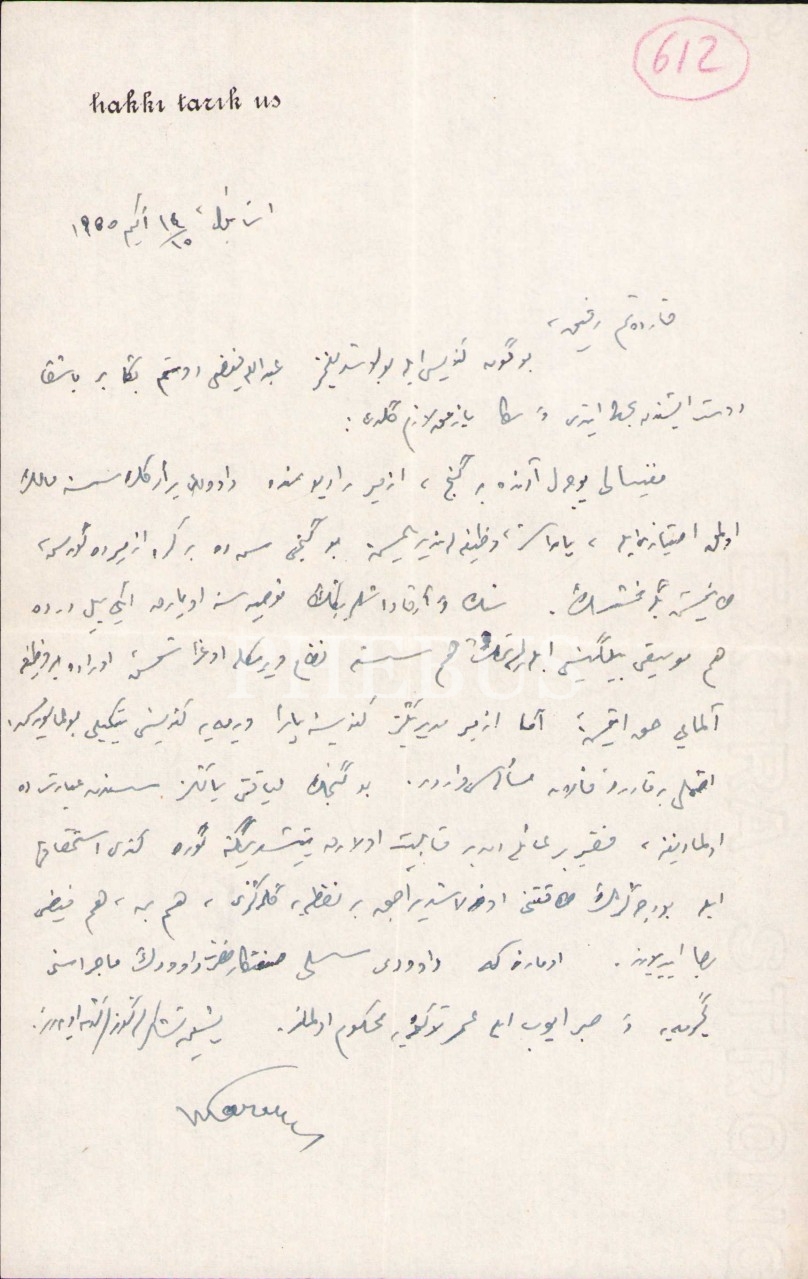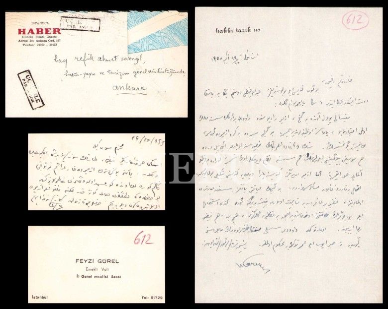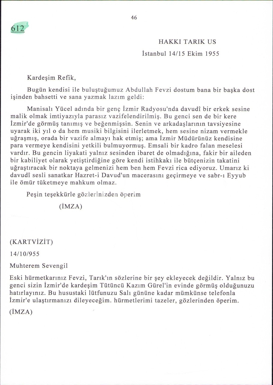 Hakkı Tarık Us'un o dönemde Basın-Yayın ve Turizm Bakanlığı'nda Radyo Dairesi genel müdürlüğünde görev yapan Refik Ahmet Sevengil'e 1955'te yazdığı Osmanlıca mektup ve kartviziti içermektedir.