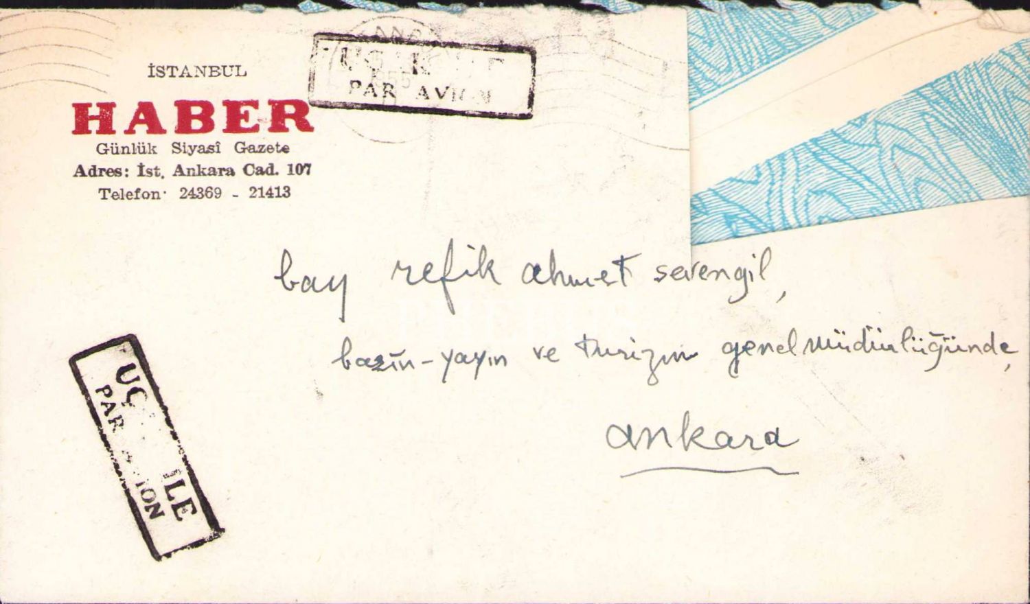 Gazeteci ve Yazar Hakkı Tarık Us'tan Refik Ahmet Sevengil'e Yazılmış Osmanlıca Mektup, Zarf ve Kartviziti İle Birlikte