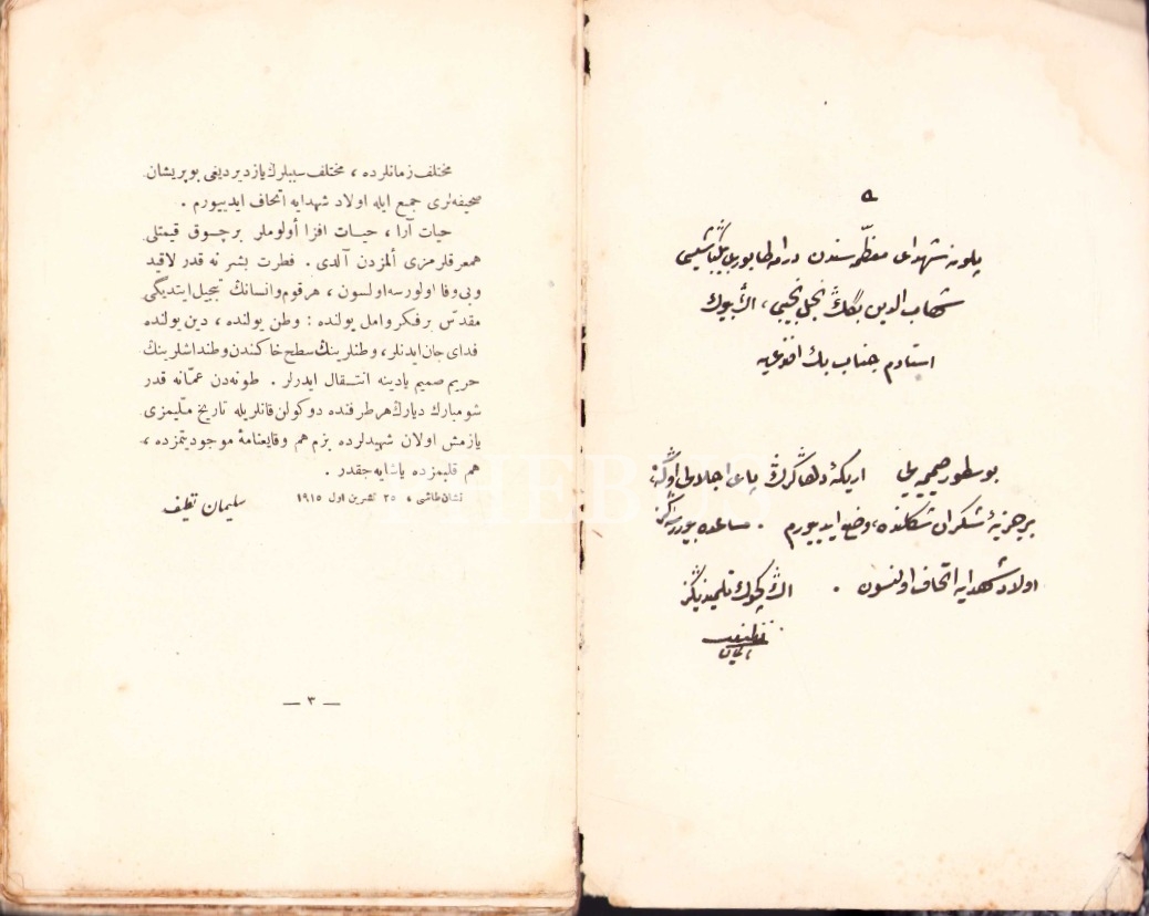 İthaf, "... Tokadizade Şekib Bey Efendi'ye yadigâr-ı uhuvvet Süleyman Nazif, 27 Eylül 1917" şeklindedir.