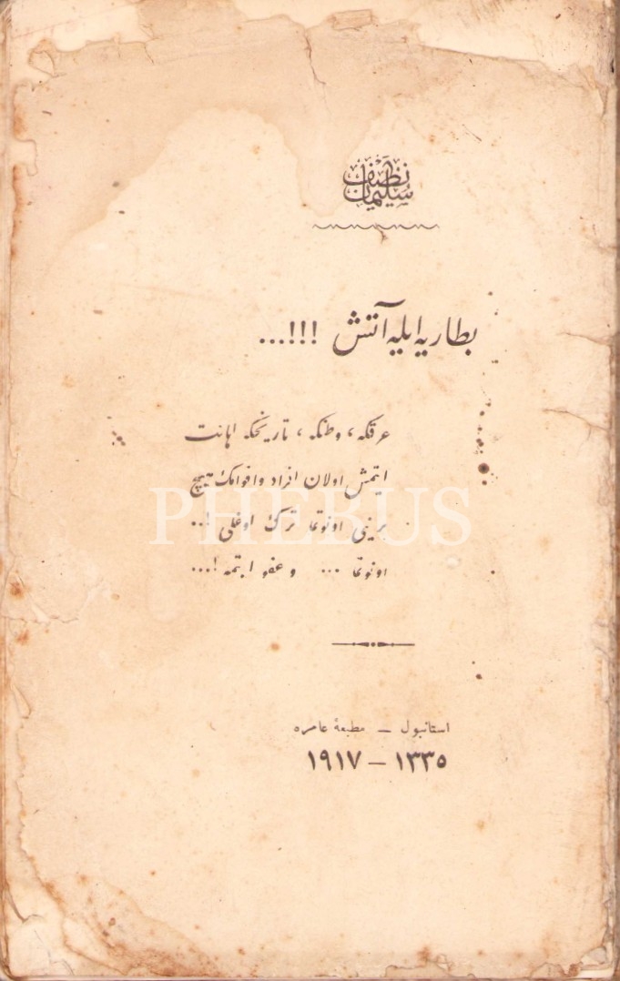Süleyman Nazif'ten Şâir Tokadizade Şekib Bey'e Osmanlıca İthaflı ve İmzalı "Batarya İle Ateş!" Kitabı, İstanbul Matbaa-i Amire 1917, 206 sayfa, arka kapağı kopuk ve oldukça yıpranmış haliyle, 14x21 cm