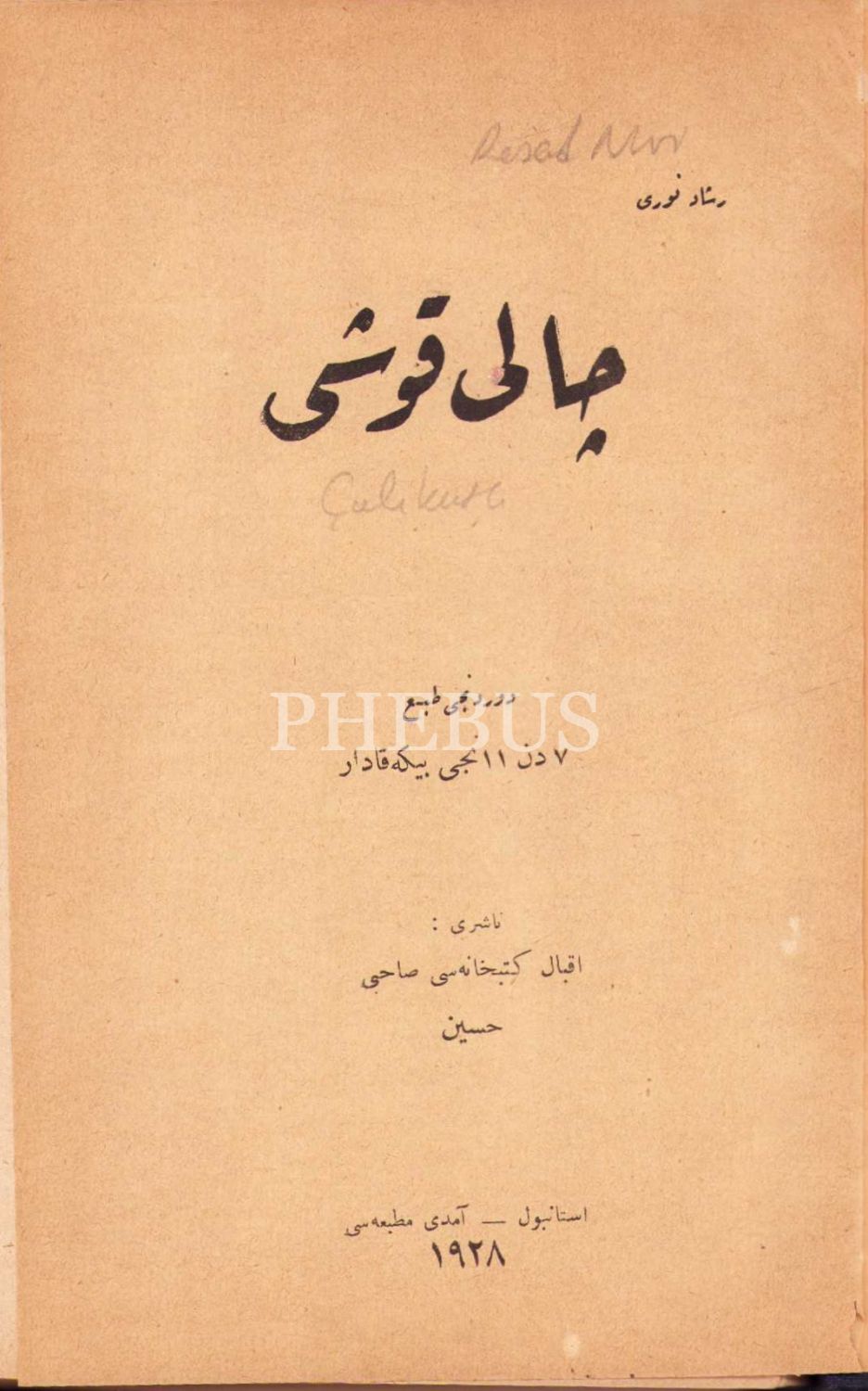 Osmanlıca Çalıkuşu, Reşad Nuri [Güntekin], Dördüncü Tabı, Naşiri: İkbal Kütüphanesi, İstanbul, Amedi Matbaası, 1928, 495 sayfa, kitap cildden ayrılmış vaziyette hâliyledir, 15x22 cm