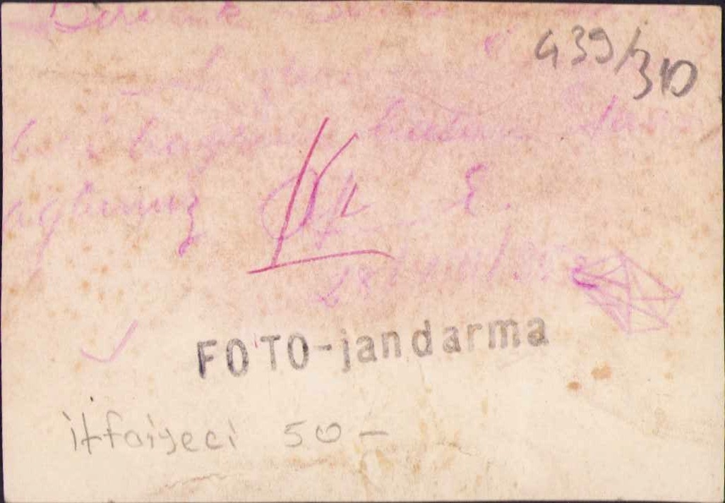 İtfaiyeci, itfaiye arabasının önünde, Foto Jandarma kaşeli, 8,5x6cm