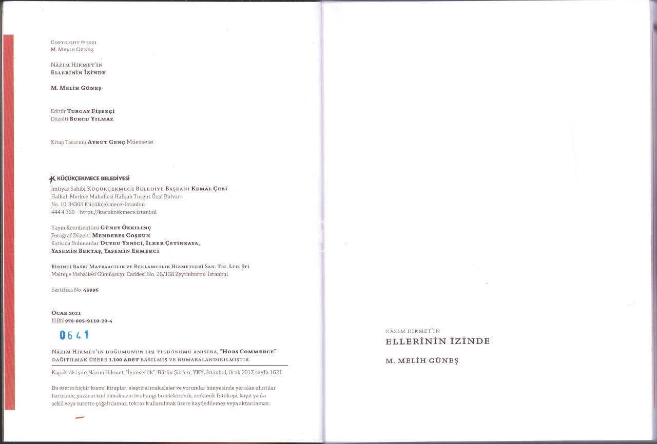M. Melih Güneş'in Hazırladığı Sınırlı Sayıda Basılan Prestij Baskı "Nazım Hikmet'in Ellerinin İzinde", Küçükçekmece Belediyesi 2021, 189 sayfa, 18x24 cm