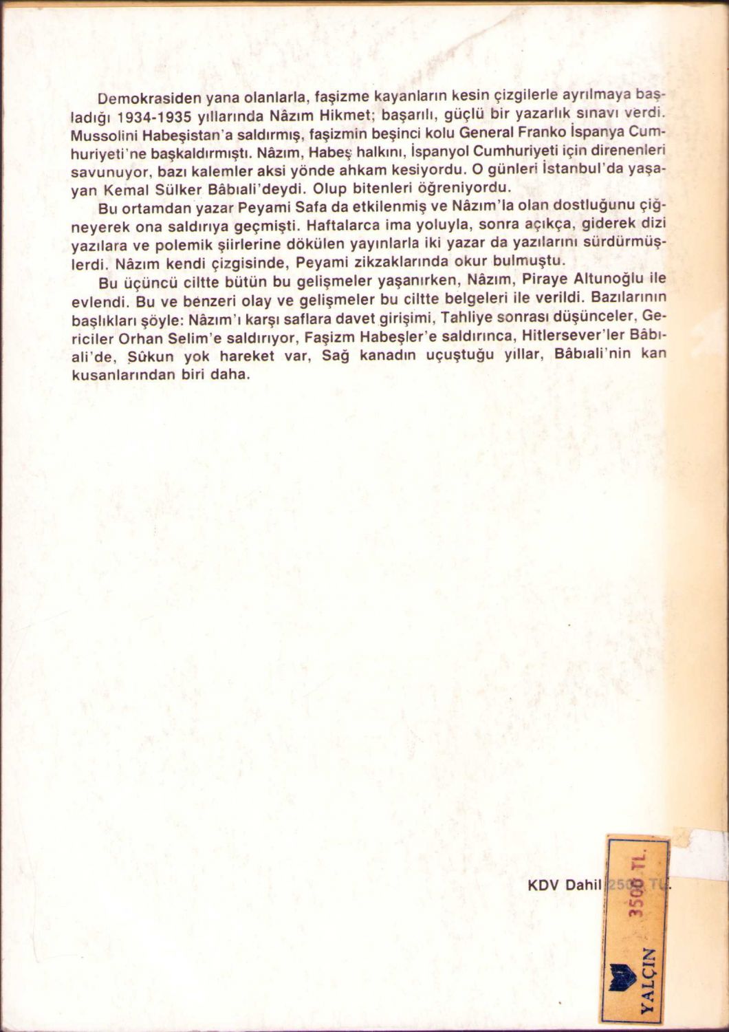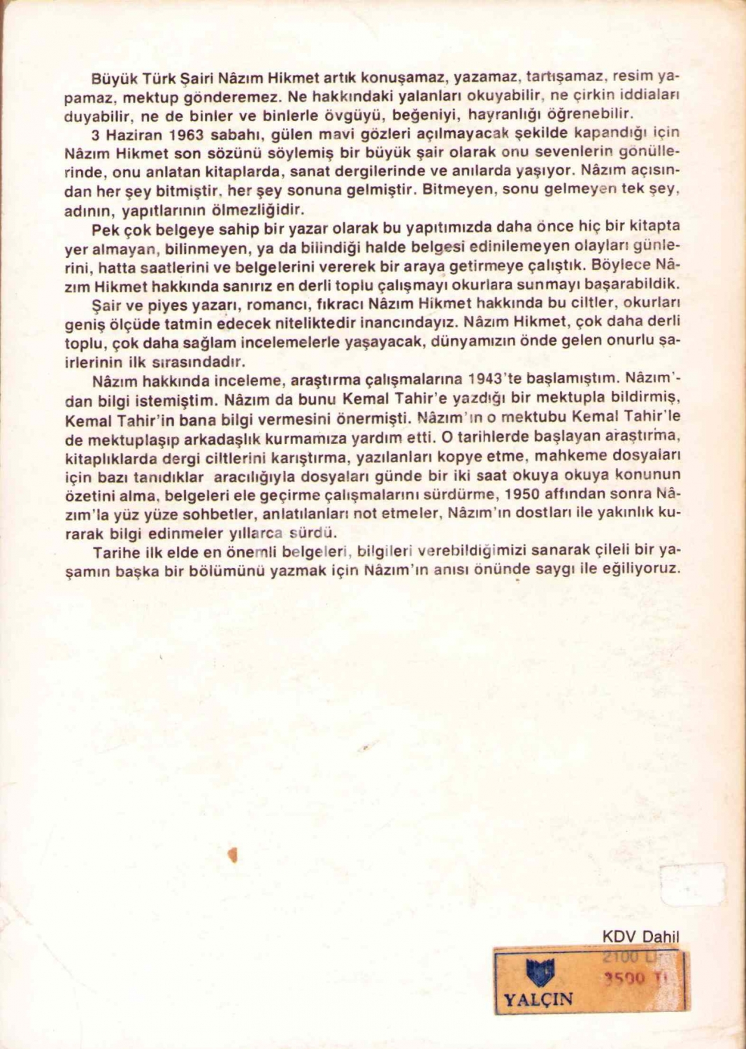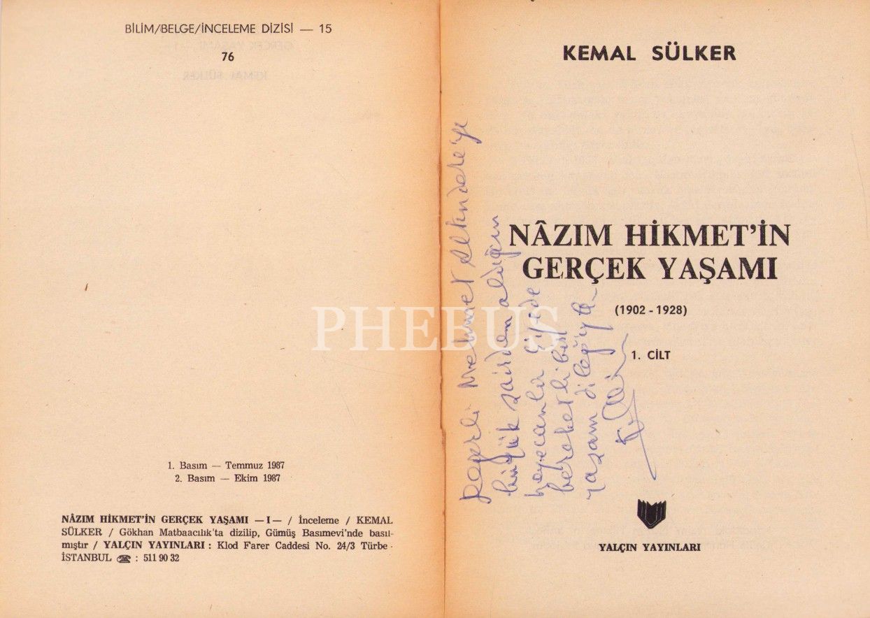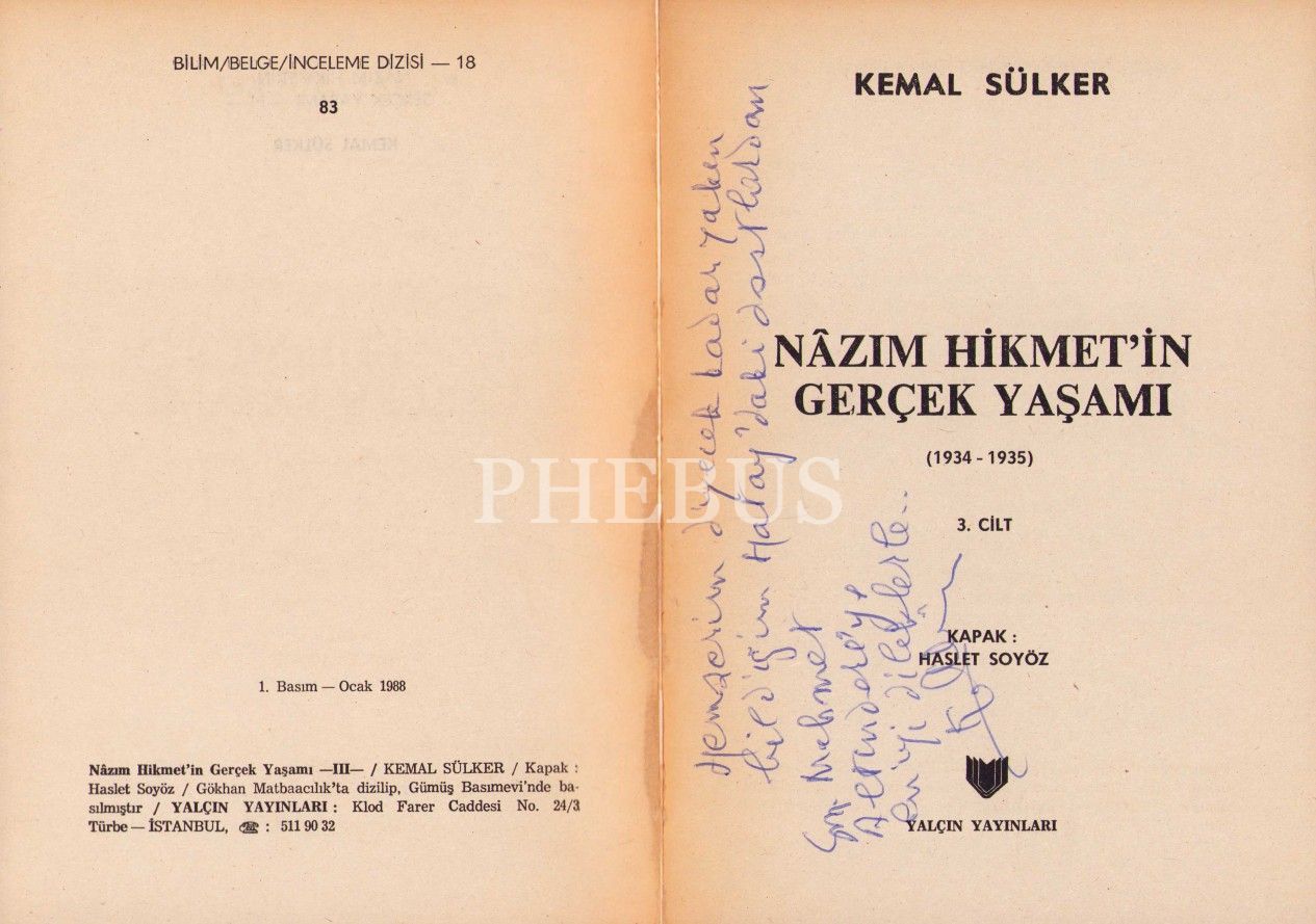 Kemal Sülker'den İthaflı ve İmzalı "Nazım Hikmet'in Gerçek Yaşamı", Yalçın Yayınları, I. ve III. Cilt, I. Cilt: 267 sayfa, III. Cilt: 269 sayfa, 13x19 cm