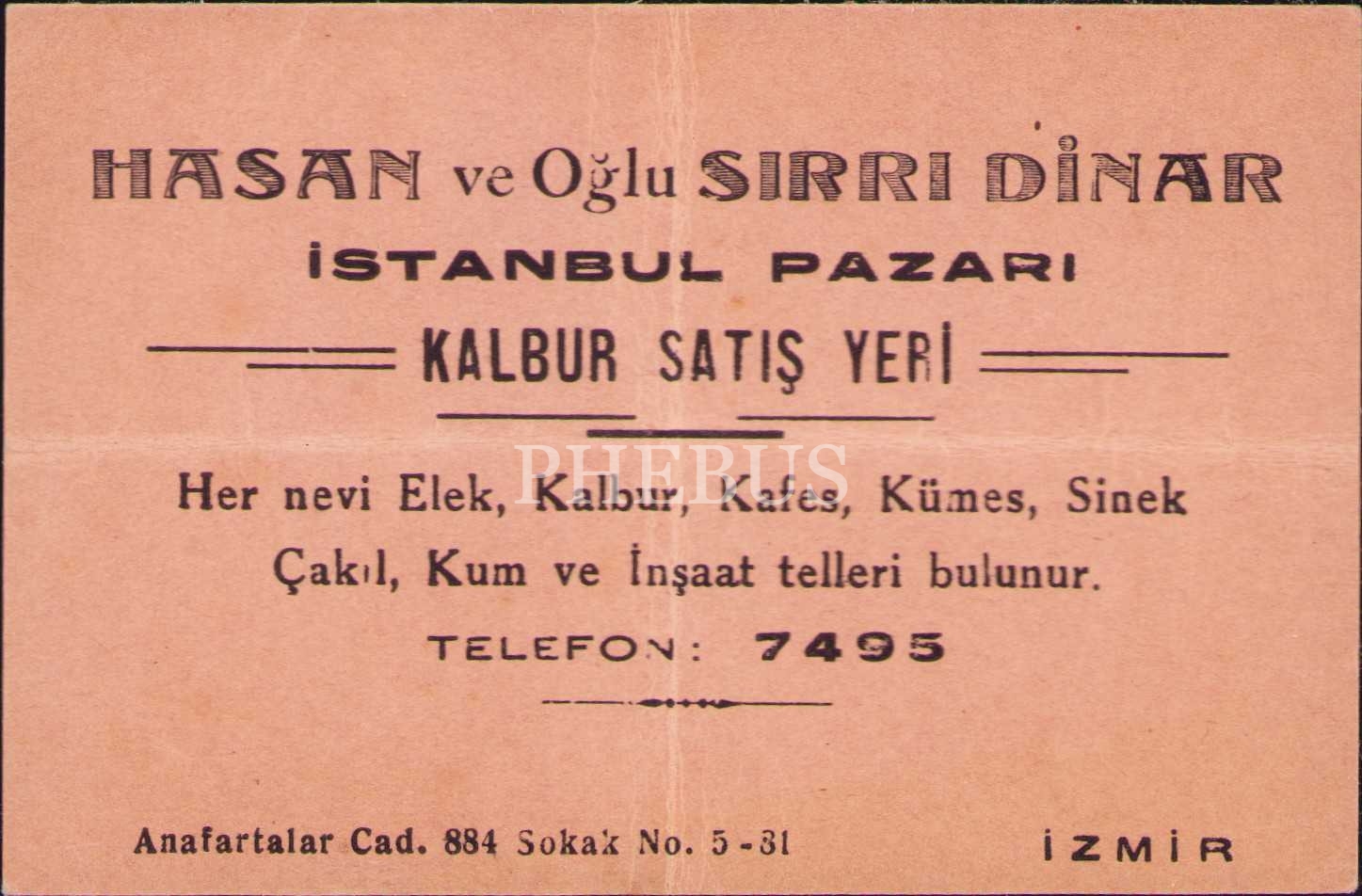 Hasan ve Oğlu Sırrı Dinar Kalbur Satış Yeri-İstanbul Pazarı reklam kartı, İzmir, 8x12 cm, yıpranmış haliyle