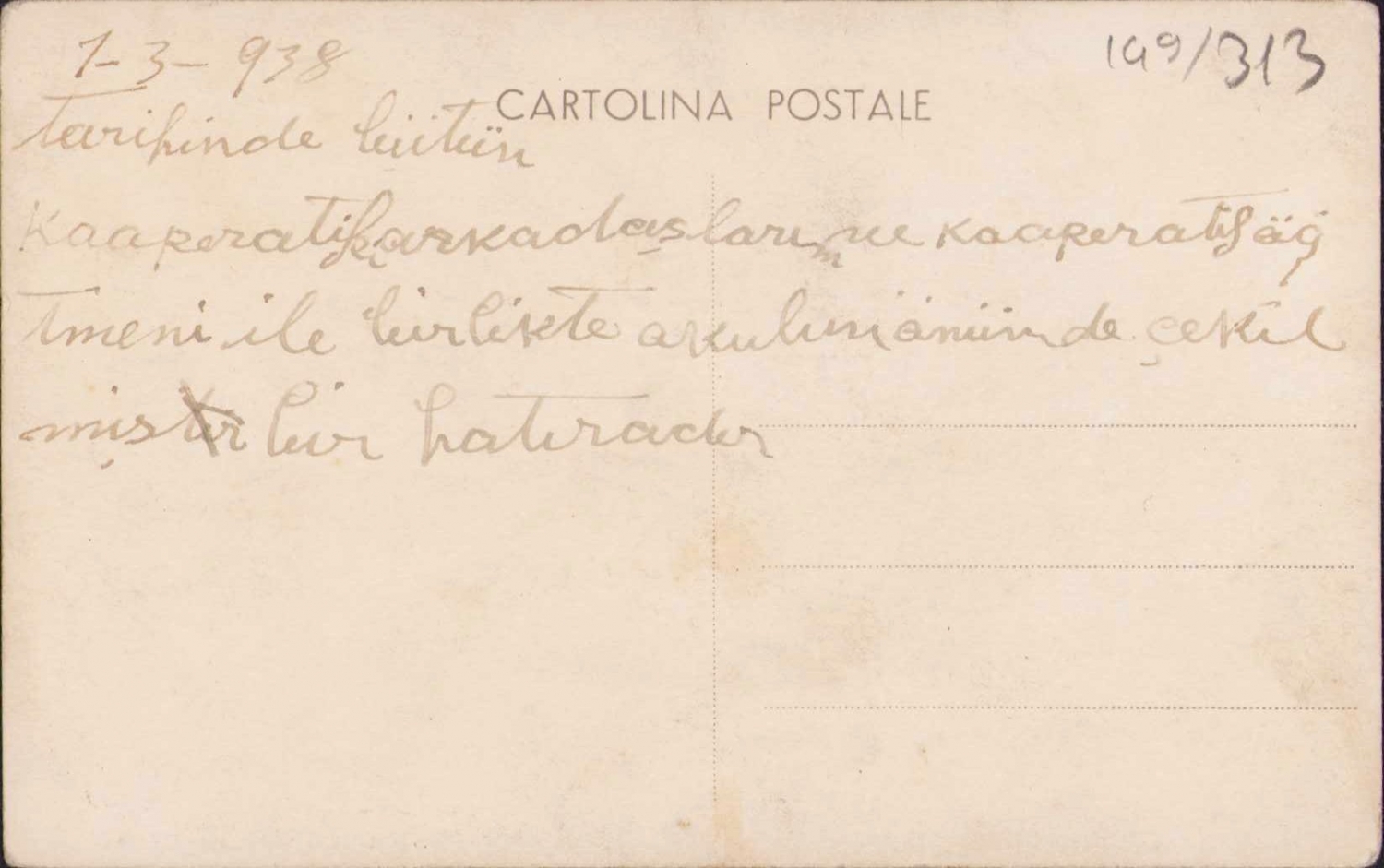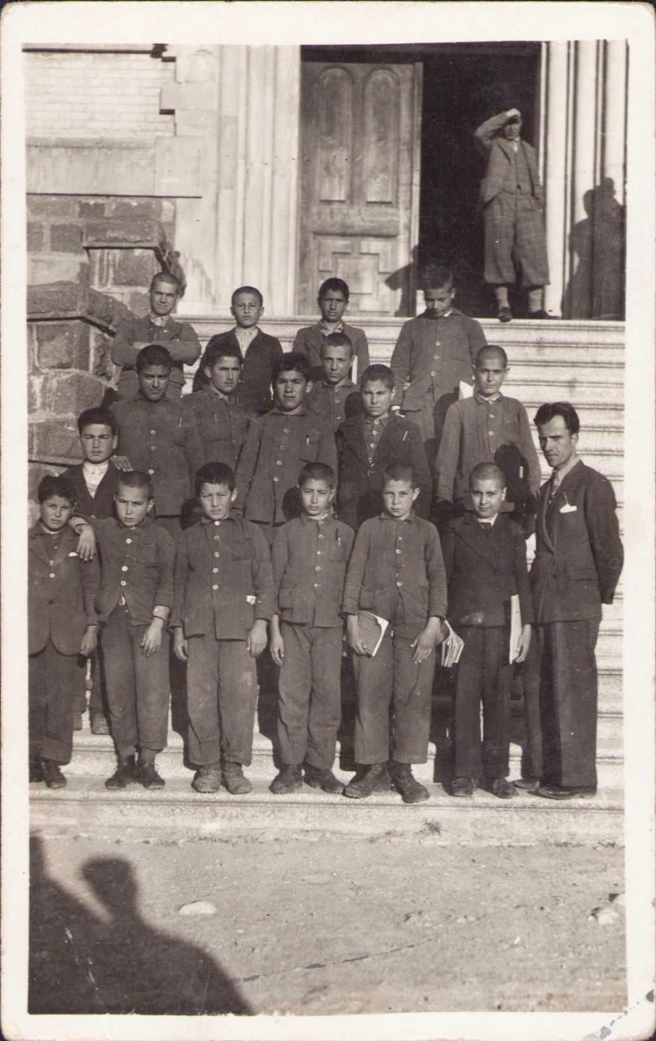 1938 tarihinde bir okul önünde öğretmen ve talebeler toplu hatıra fotoğrafı, 9x14 cm